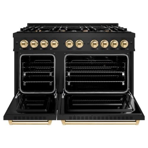 Luxury isn’t meant to be desired - it’s meant to be attainable. The ZLINE Autograph Edition 48 in. 6.7 cu. ft. Classic Double Oven Dual Fuel Range with 8 Burner Gas Cooktop in Black Stainless Steel and Polished Gold Accents (CDRBZ-48-G) combines the elegance of a large electric convection oven with an energy-efficient cooling fan to ensure quiet operation and a small bake-and-broil oven with Landscape window designs, and stunning polished gold knobs and handles allowing you to master every meal. With a modern, timeless style and refined functionality, ZLINE Classic Dual Fuel Ranges are masterfully crafted to deliver an elevated culinary experience.