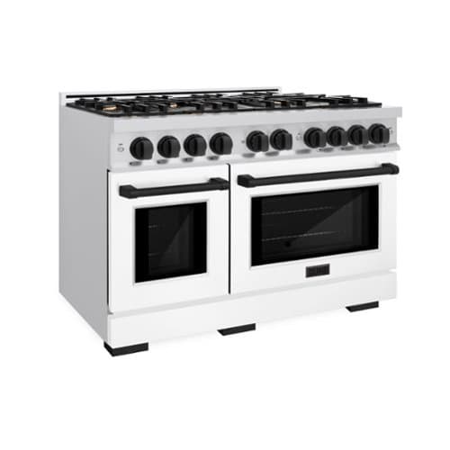 Luxury isn’t meant to be desired - it’s meant to be attainable. The ZLINE Autograph Edition 48 in. 6.7 cu. ft. Select Double Oven Gas Range with 8 Burner Cooktop in Stainless Steel with White Matte Doors and Matte Black Accents (HGRZ-WM-48-MB) combines the elegance of a hand-finished porcelain gas cooktop with 8 Italian-made auto-reignition burners, a large gas convection oven with an energy-efficient cooling fan to ensure quiet operation, a small baking oven, beautiful white matte doors with Horizon window designs, and stunning bronze matte black and handles allowing you to master every meal. With a modern, timeless style and refined functionality, ZLINE Select Gas Ranges are masterfully crafted to deliver an elevated culinary experience.