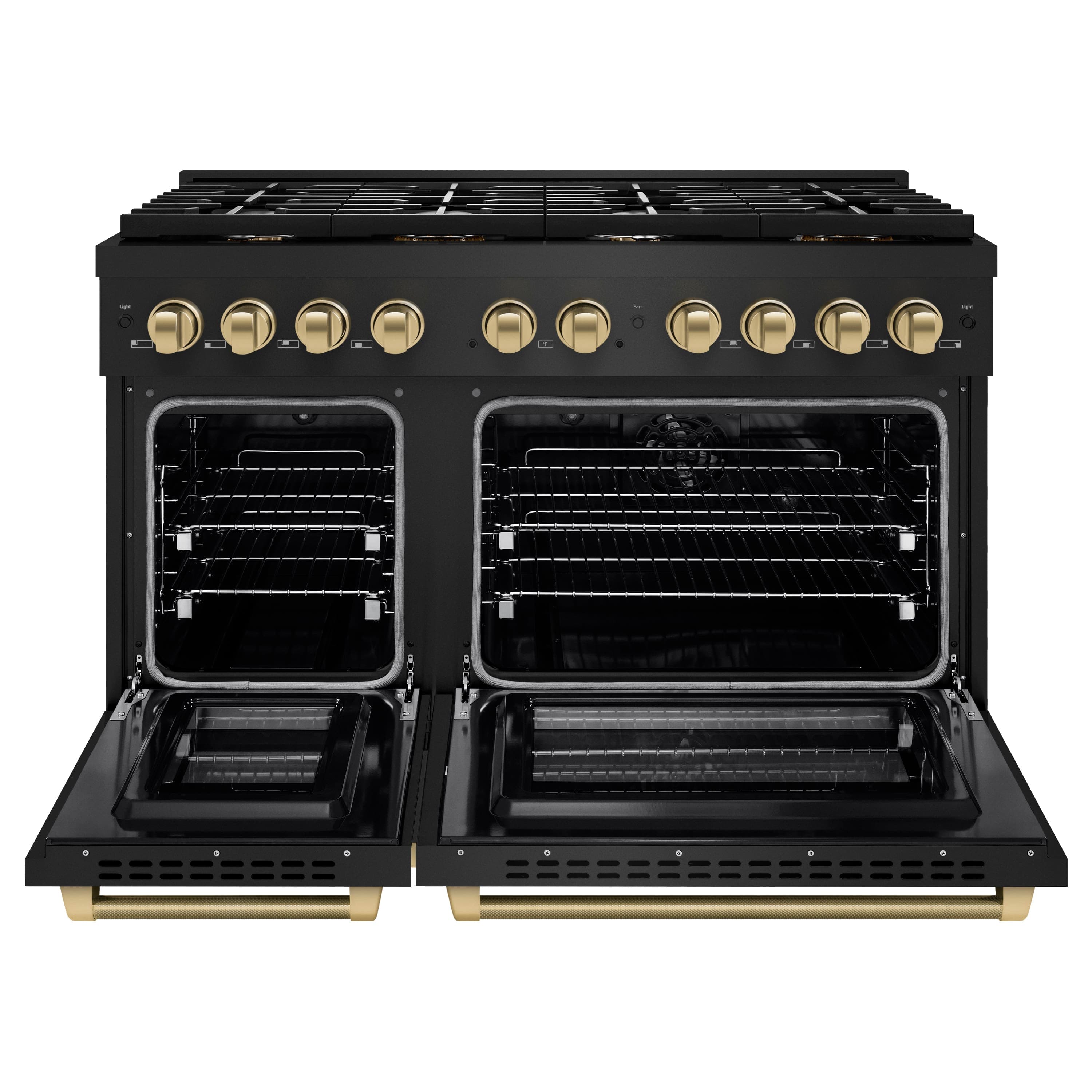 Luxury isn’t meant to be left desired—it’s meant to be attainable. The ZLINE Autograph Edition 48 in. 6.7 cu. ft. Paramount Double Oven Dual Fuel Range with 8 Burner Gas Cooktop in Black Stainless Steel and Champagne Bronze Helix Handles and Knob Accents (SDRBZ-48-KCB) combines the versatility of a gas cooktop with 8 Italian-made auto-reignition burners, a large high-performing electric convection oven and a small bake-and-broil oven with digital thermostat technology, enhanced cast iron grates, and Horizon oven door window designs allowing you to master every meal. With a modern, timeless style and refined functionality, ZLINE Paramount Dual Fuel Ranges are masterfully crafted to deliver an elevated culinary experience.