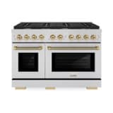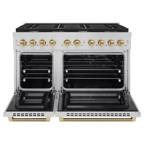 Luxury isn’t meant to be left desired—it’s meant to be attainable. The ZLINE Autograph Edition 48 in. 6.7 cu. ft. Paramount Double Oven Dual Fuel Range with 8 Burner Gas Cooktop in Stainless Steel and Champagne Bronze Helix Handles and Knob Accents (SDRZ-48-KCB) combines the versatility of a gas cooktop with 8 Italian-made auto-reignition burners, a large high-performing electric convection oven and a small bake-and-broil oven with digital thermostat technology, enhanced cast iron grates, and Horizon oven door window designs allowing you to master every meal. With a modern, timeless style and refined functionality, ZLINE Paramount Dual Fuel Ranges are masterfully crafted to deliver an elevated culinary experience.