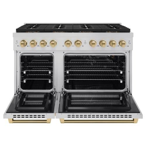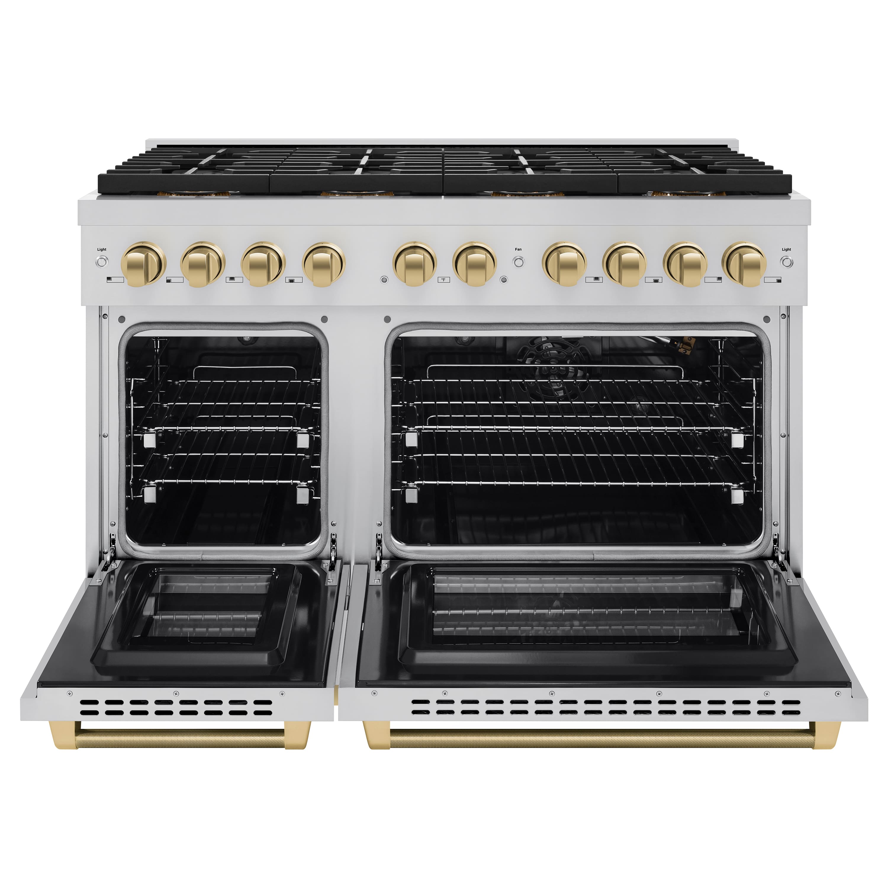 Luxury isn’t meant to be left desired—it’s meant to be attainable. The ZLINE Autograph Edition 48 in. 6.7 cu. ft. Paramount Gas Range with 8 Burner DuoPro™ Cooktop and Dual Ovens in Stainless Steel with Champagne Bronze Helix Handles and Accents (PSGRZ-48-KCB) features a high-powered gas cooktop with 8 hand-crafted Italian dual-ring brass burners and a versatile gas convection oven allowing you to master every meal. With ZLINE DuoPro™, every burner brings the performance you need—wherever you need it.
