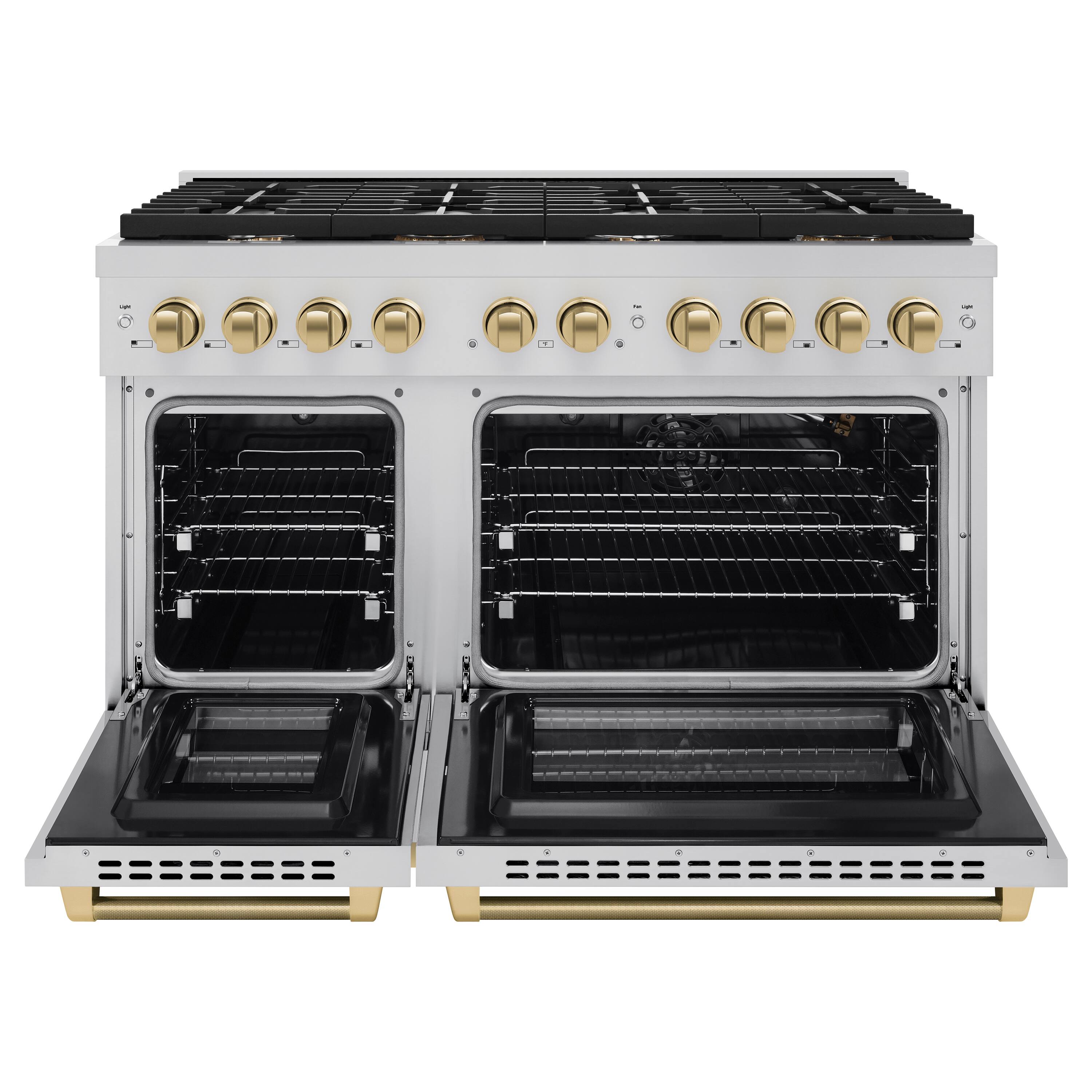 Luxury isn’t meant to be left desired—it’s meant to be attainable. The ZLINE Autograph Edition 48 in. 6.7 cu. ft. Paramount Double Oven Gas Range with 8 Burner Cooktop in Stainless Steel and Champagne Bronze Helix Handles and Knob Accents (SGRZ-48-KCB) features a versatile gas cooktop with 8 Italian-made auto-reignition burners, a large high-performing gas convection oven, a small baking oven, enhanced cast iron grates, and Horizon oven door window designs allowing you to master every meal. With a modern, timeless style and refined functionality, ZLINE Paramount Gas Ranges are masterfully crafted to deliver an elevated culinary experience.