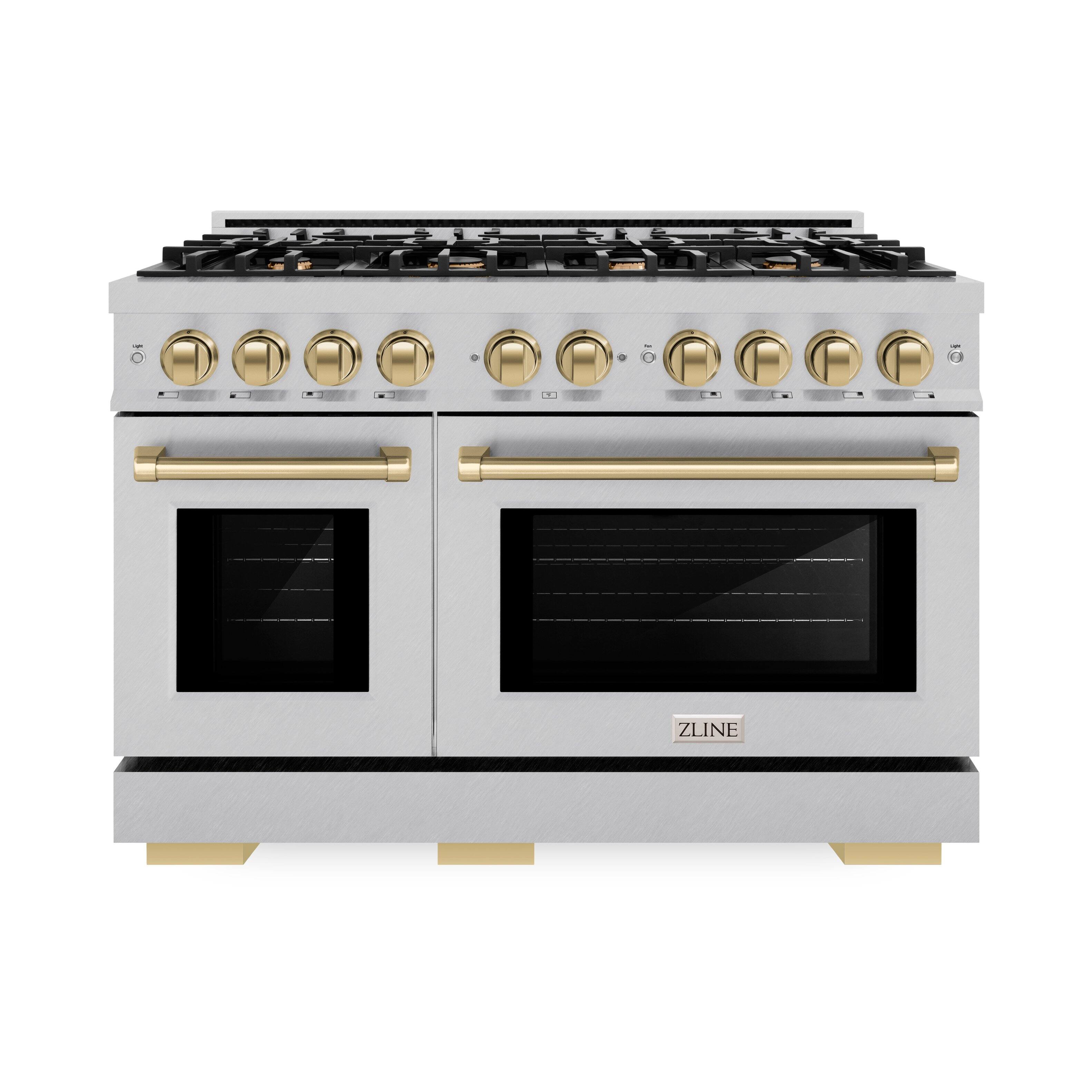 Luxury isn’t meant to be desired - it’s meant to be attainable. The ZLINE Autograph Edition 48 in. 6.7 cu. ft. Select Double Oven Gas Range with 8 Burner Cooktop in DuraSnow Stainless Steel and Champagne Bronze Accents (HGRSZ-48-CB) combines the elegance of a hand-finished porcelain gas cooktop with 8 Italian-made auto-reignition burners, a large gas convection oven with an energy-efficient cooling fan to ensure quiet operation, a small baking oven, Horizon oven door window designs, and stunning champagne bronze knobs and handles allowing you to master every meal. With a modern, timeless style and refined functionality, ZLINE Select Gas Ranges are masterfully crafted to deliver an elevated culinary experience.