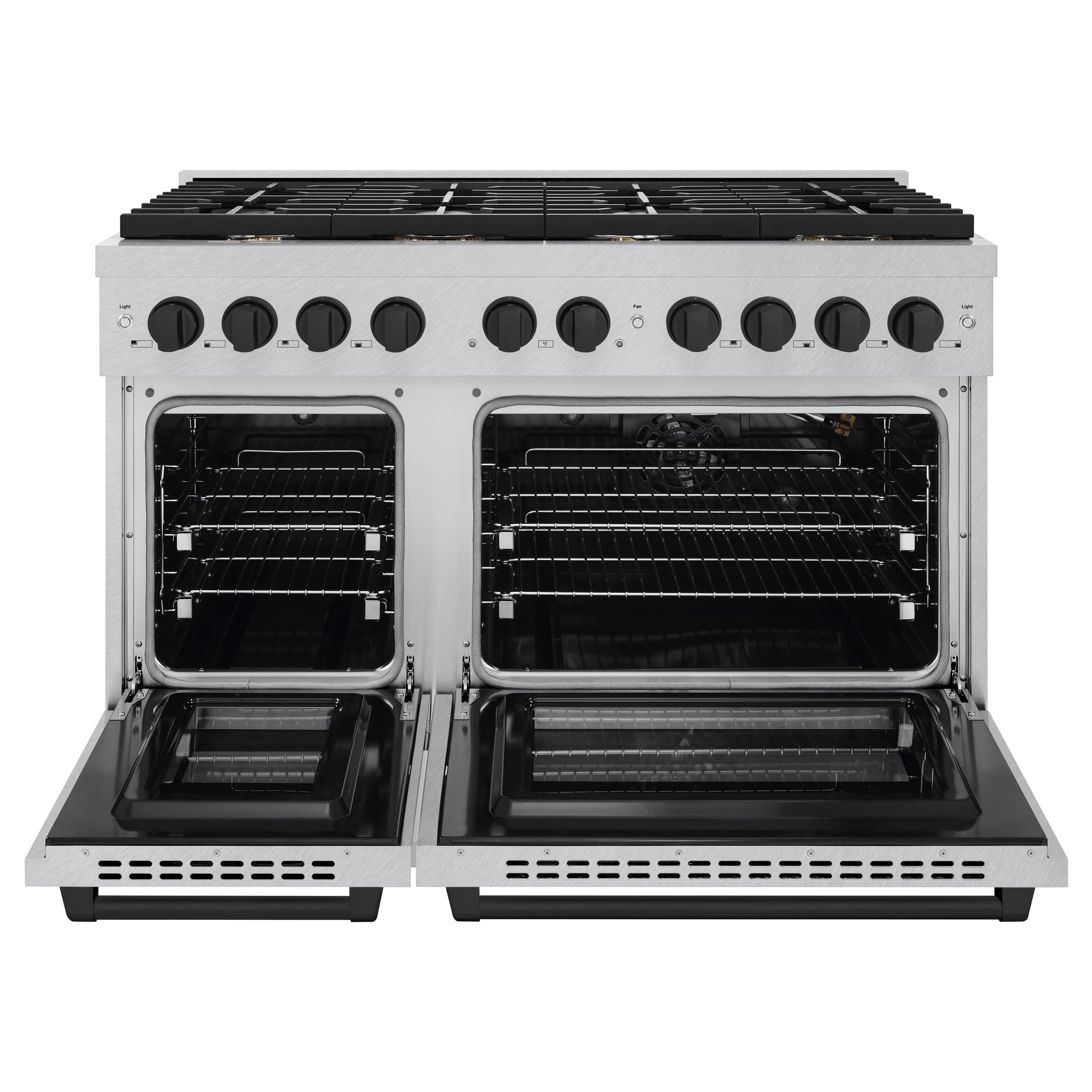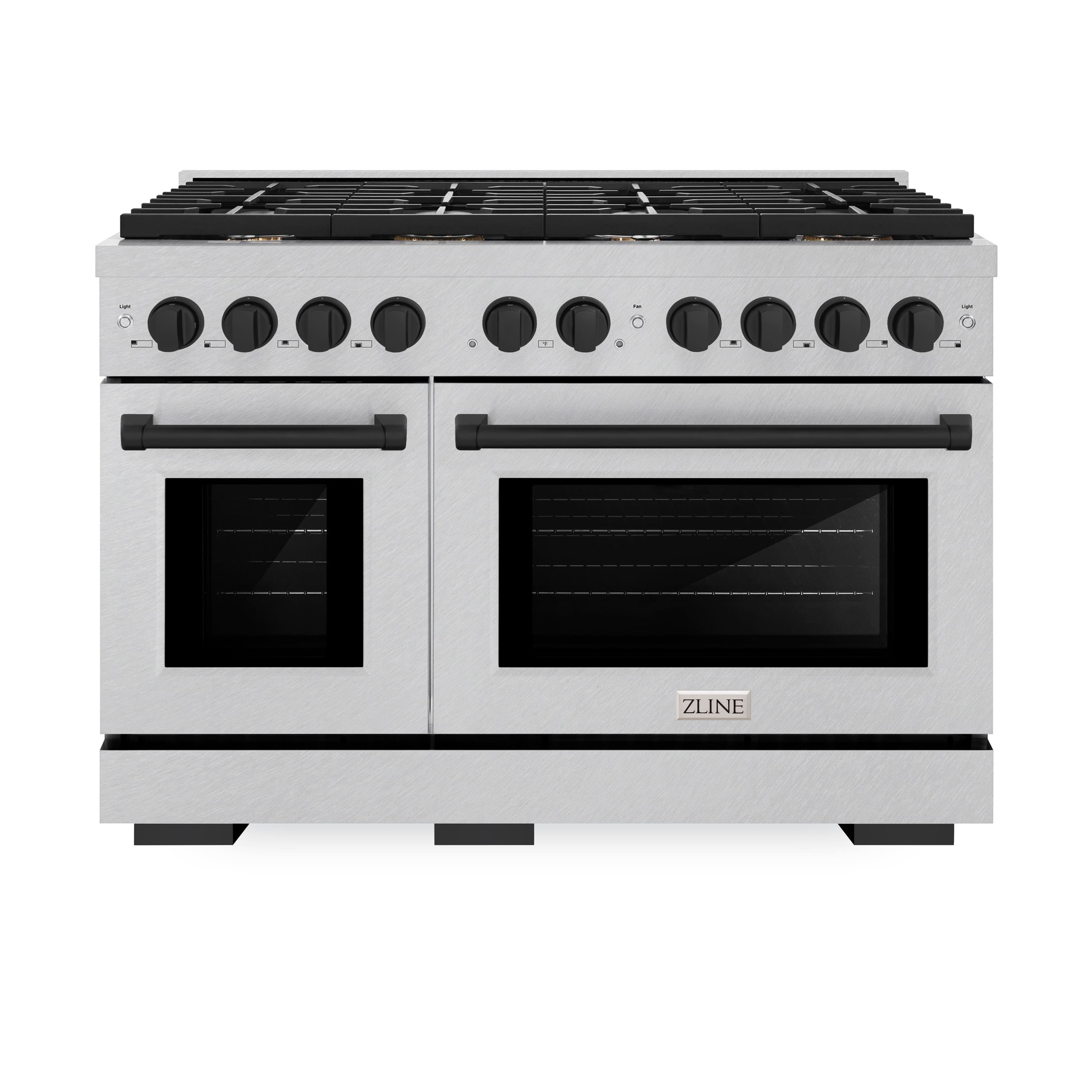 Luxury isn’t meant to be left desired — it’s meant to be attainable. The ZLINE Autograph Edition 48 in. 6.7 cu. ft. Paramount Double Oven Gas Range with 8 Burner Cooktop in Satin Stainless Steel and Matte Black Accents (SGRSZ-48-MB) features a versatile gas cooktop with 8 Italian-made auto-reignition burners, a large high-performing gas convection oven, a small baking oven, enhanced cast iron grates, Horizon oven door window designs, and elegant matte black knobs and handles allowing you to master every meal. With a modern, timeless style and refined functionality, ZLINE Paramount Gas Ranges are masterfully crafted to deliver an elevated culinary experience.