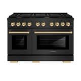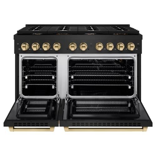 Luxury isn’t meant to be desired - it’s meant to be attainable. The ZLINE Autograph Edition 48 in. 6.7 cu. ft. Paramount Double Oven Gas Range with 8 Burner Cooktop in Black Stainless Steel and Polished Gold Accents (SGRBZ-48-G) features a versatile gas cooktop with 8 Italian-made auto-reignition burners, a large high-performing gas convection oven, a small baking oven, enhanced cast iron grates, Horizon oven door window designs, and elegant polished gold knobs and handles allowing you to master every meal. With a modern, timeless style and refined functionality, ZLINE Paramount Gas Ranges are masterfully crafted to deliver an elevated culinary experience.
