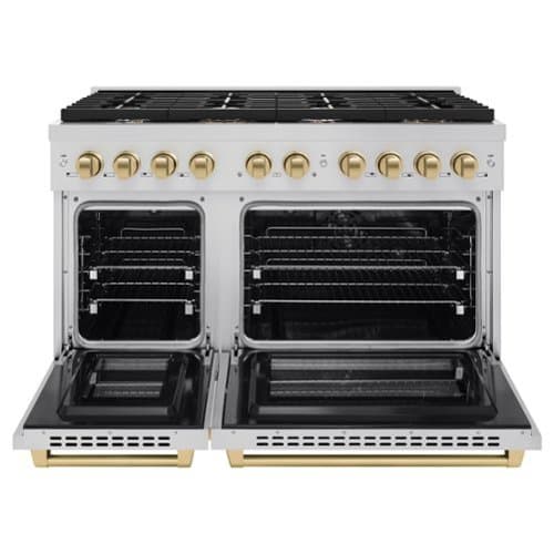 Luxury isn’t meant to be left desired—it’s meant to be attainable. The ZLINE Autograph Edition 48 in. 6.7 cu. ft. Paramount Double Oven Dual Fuel Range with 8 Burner Gas Cooktop in Stainless Steel and Champagne Bronze Accents (SDRZ-48-CB) combines the versatility of a gas cooktop with 8 Italian-made auto-reignition burners, a large high-performing electric convection oven and a small bake-and-broil oven with digital thermostat technology, enhanced cast iron grates, Horizon oven door window designs, and champagne bronze knobs and handles allowing you to master every meal. With a modern, timeless style and refined functionality, ZLINE Paramount Dual Fuel Ranges are masterfully crafted to deliver an elevated culinary experience.