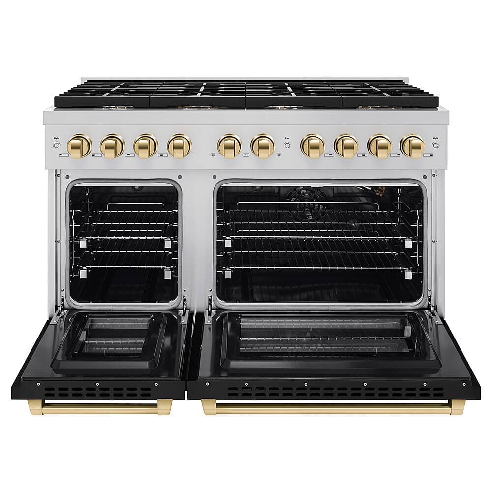 Luxury isn’t meant to be desired - it’s meant to be attainable. The ZLINE Autograph Edition 48 in. 6.7 cu. ft. Paramount Double Oven Gas Range with 8 Burner Cooktop in Stainless Steel with Black Matte Doors and Polished Gold Accents (SGRZ-BLM-48-G) features a versatile gas cooktop with 8 Italian-made auto-reignition burners, a large high-performing gas convection oven, a small baking oven, enhanced cast iron grates, beautiful black matte doors with Horizon window designs, and elegant polished gold knobs and handles allowing you to master every meal. With a modern, timeless style and refined functionality, ZLINE Paramount Gas Ranges are masterfully crafted to deliver an elevated culinary experience.