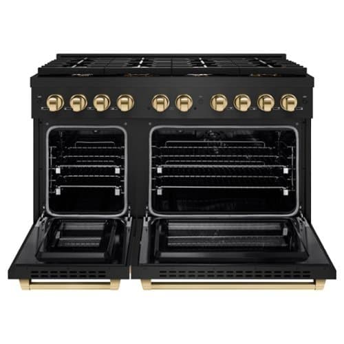 Luxury isn’t meant to be desired - it’s meant to be attainable. The ZLINE Autograph Edition 48 in. 6.7 cu. ft. Paramount Double Oven Dual Fuel Range with 8 Burner Gas Cooktop in Black Stainless Steel and Polished Gold Accents (SDRBZ-48-G) combines the versatility of a gas cooktop with 8 Italian-made auto-reignition burners, a large high-performing electric convection oven and a small bake-and-broil oven with digital thermostat technology, enhanced cast iron grates, Horizon oven door window designs, and polished gold knobs and handles allowing you to master every meal. With a modern, timeless style and refined functionality, ZLINE Paramount Dual Fuel Ranges are masterfully crafted to deliver an elevated culinary experience.