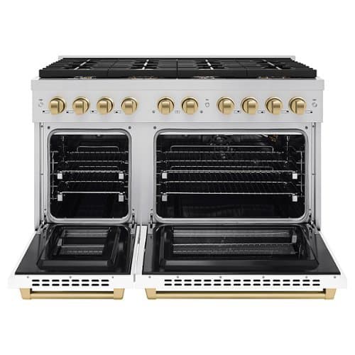 Luxury isn’t meant to be desired - it’s meant to be attainable. The ZLINE Autograph Edition 48 in. 6.7 cu. ft. Paramount Double Oven Gas Range with 8 Burner Cooktop in Stainless Steel with White Matte Doors and Champagne Bronze Accents (SGRZ-WM-48-CB) features a versatile gas cooktop with 8 Italian-made auto-reignition burners, a large high-performing gas convection oven, a small baking oven, enhanced cast iron grates, beautiful white matte doors with Horizon window designs, and elegant champagne bronze knobs and handles allowing you to master every meal. With a modern, timeless style and refined functionality, ZLINE Paramount Gas Ranges are masterfully crafted to deliver an elevated culinary experience.