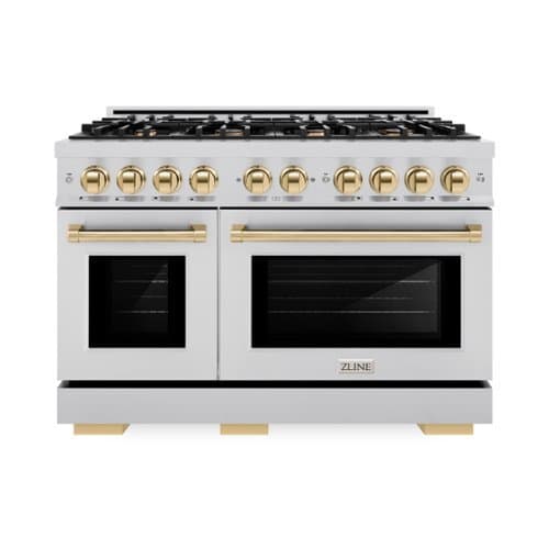 Luxury isn’t meant to be desired - it’s meant to be attainable. The ZLINE Autograph Edition 48 in. 6.7 cu. ft. Select Double Oven Dual Fuel Range with 8 Burner Gas Cooktop in Stainless Steel and Polished Gold Accents (HDRZ-48-G) combines the elegance of a hand-finished porcelain gas cooktop with 8 Italian-made auto-reignition burners, a large electric convection oven with an energy-efficient cooling fan to ensure quiet operation, a small bake-and-broil oven, Horizon oven door window designs, and stunning polished gold knobs and handles allowing you to master every meal. With a modern, timeless style and refined functionality, ZLINE Select Dual Fuel Ranges are masterfully crafted to deliver an elevated culinary experience.