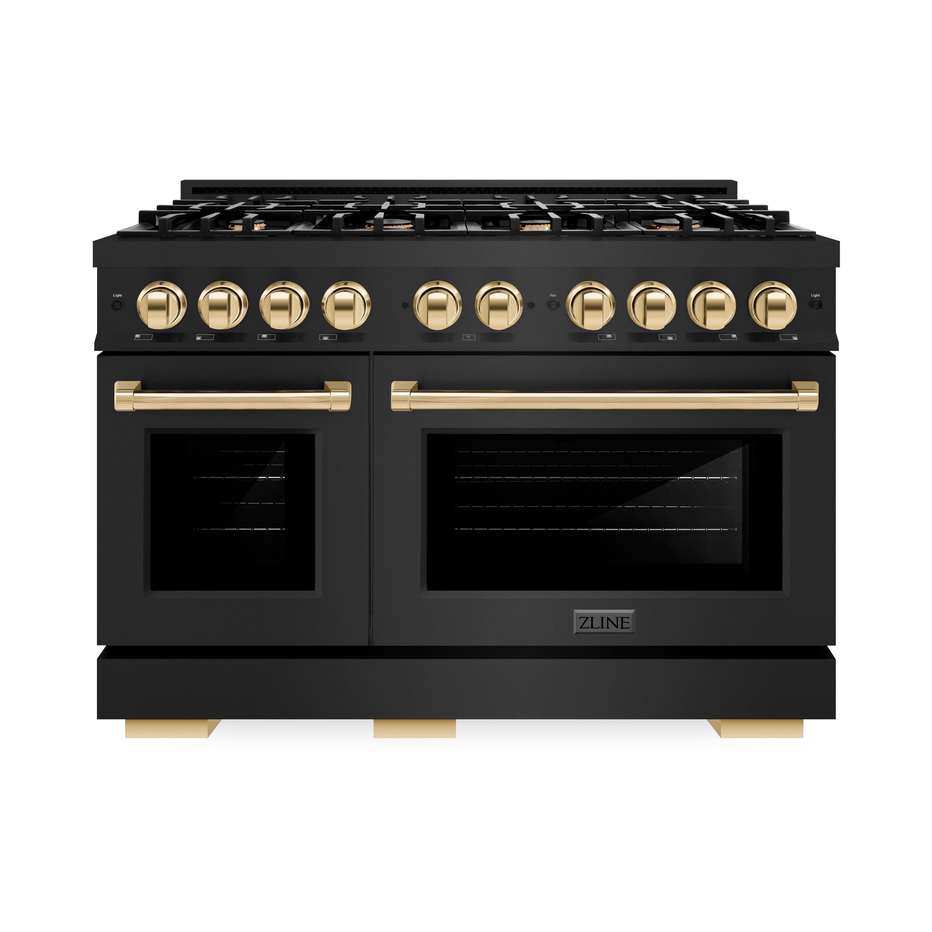 Luxury isn’t meant to be desired - it’s meant to be attainable. The ZLINE Autograph Edition 48 in. 6.7 cu. ft. Select Double Oven Dual Fuel Range with 8 Burner Gas Cooktop in Black Stainless Steel and Polished Gold Accents (HDRBZ-48-G) combines the elegance of a hand-finished porcelain gas cooktop with 8 Italian-made auto-reignition burners, a large electric convection oven with an energy-efficient cooling fan to ensure quiet operation, a small bake-and-broil oven, Horizon oven door window designs, and stunning polished gold knobs and handles allowing you to master every meal. With a modern, timeless style and refined functionality, ZLINE Select Dual Fuel Ranges are masterfully crafted to deliver an elevated culinary experience.