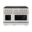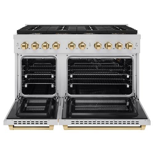 Luxury isn’t meant to be desired - it’s meant to be attainable. The ZLINE Autograph Edition 48 in. 6.7 cu. ft. Paramount Double Oven Gas Range with 8 Burner Cooktop in Stainless Steel and Polished Gold Accents (SGRZ-48-G) features a versatile gas cooktop with 8 Italian-made auto-reignition burners, a large high-performing gas convection oven, a small baking oven, enhanced cast iron grates, Horizon oven door window designs, and elegant polished gold knobs and handles allowing you to master every meal. With a modern, timeless style and refined functionality, ZLINE Paramount Gas Ranges are masterfully crafted to deliver an elevated culinary experience.