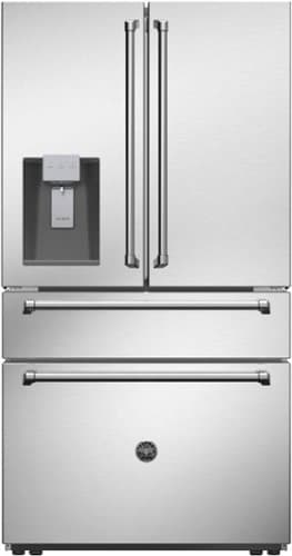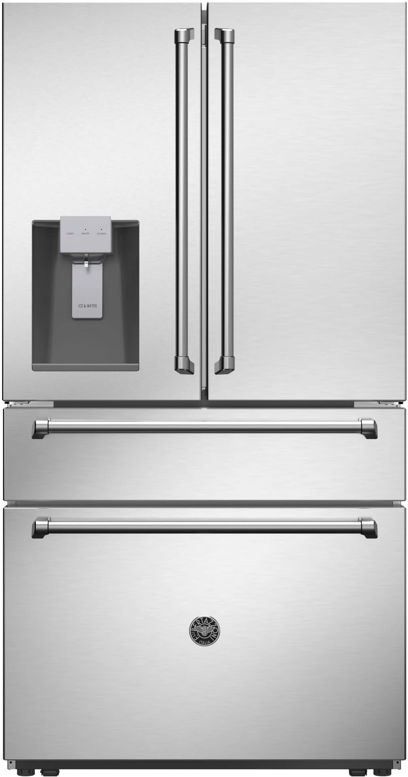 The Bertazzoni 36” French-door stainless steel refrigerator is designed and engineered with the highest grade materials and components. Using one of the 3 available handle kits in Professional, Master and Heritage Series style, this refrigerator integrates seamlessly with all other Bertazzoni appliances into style-harmonized suites for a true, high-performing kitchen. This counter-deep refrigerator has ample storage capacity, with 15 cubic feet of refrigerator volume and 6 cubic feet of freezer. Dual No-Frost air-cooling system for the separate refrigerator and freezer compartments provide optimal temperature and humidity control to keep food fresher longer. The internal configuration of the upper compartment is designed for maximum flexibility, with glass shelves that move and fold, high-capacity drawers and crispers with dedicated temperature and humidity controls, and several gallon-size storage bins in both doors. Two freezer drawers allow easy access, and the top compartment holds the tray for the automated ice-maker. All Bertazzoni appliances are covered by a 2-year warranty. Products and packaging are 99% recyclable.