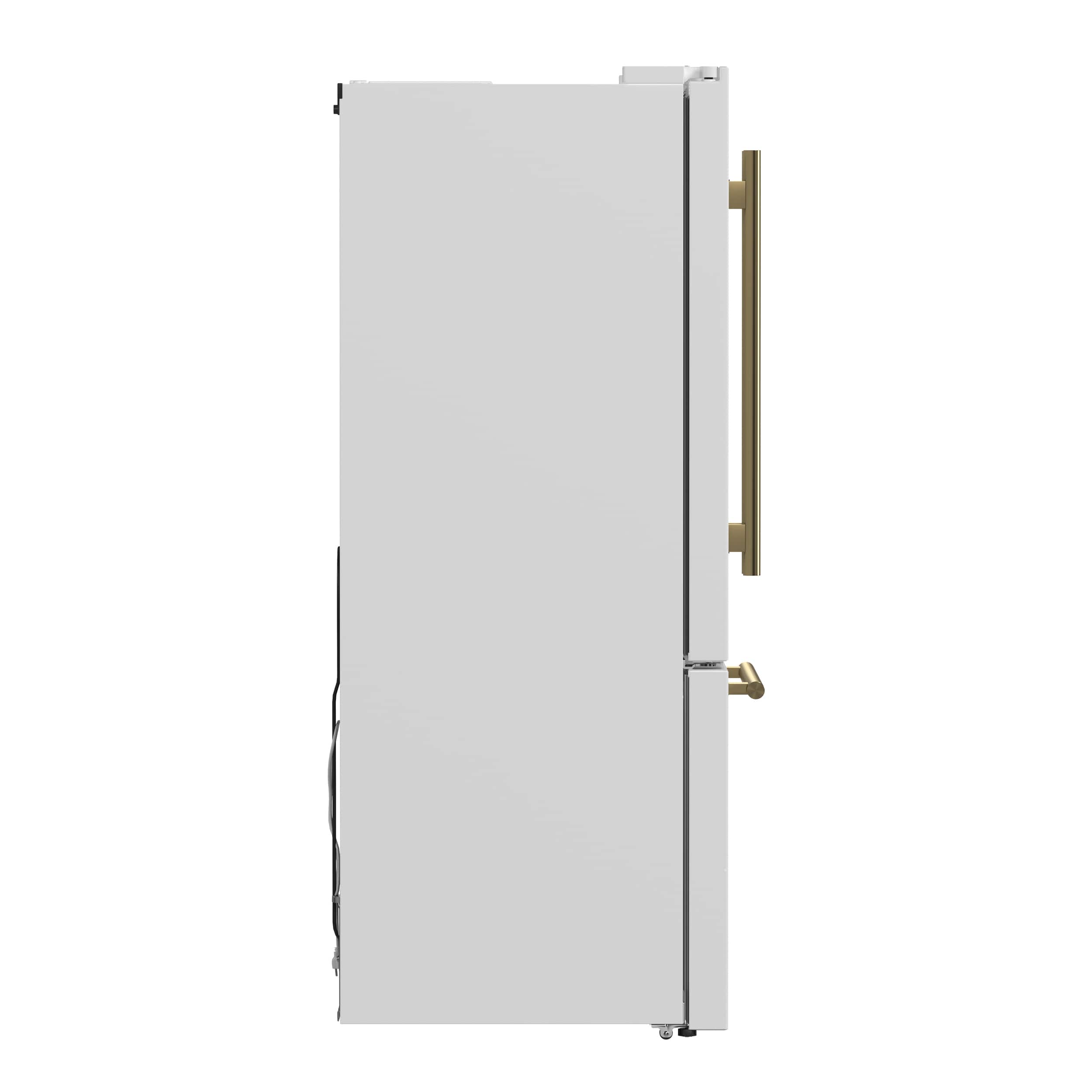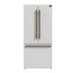 The Forno Gallipoli 17.5 Cu. Ft. 30" Freestanding French Door Refrigerator in white offers a perfect blend of style, efficiency, and modern cooling technology. Its 17.5 cu. ft. capacity includes 12.4 cu. ft. of fresh food storage with adjustable glass shelves, crisper drawers, and spacious door bins, while the 5.1 cu. ft. freezer features a pull-out drawer, dual storage bins, and an automatic ice maker producing up to 4 lbs. of ice daily. A high-efficiency inverter compressor ensures quiet operation and precise temperature control, while the LED touch panel allows effortless adjustments. ENERGY STAR Certified for optimal performance, this refrigerator also features bright LED lighting to reduce spoilage. Finished with antique brass handles and a modern decorative grill, it adds a sophisticated touch to any kitchen.