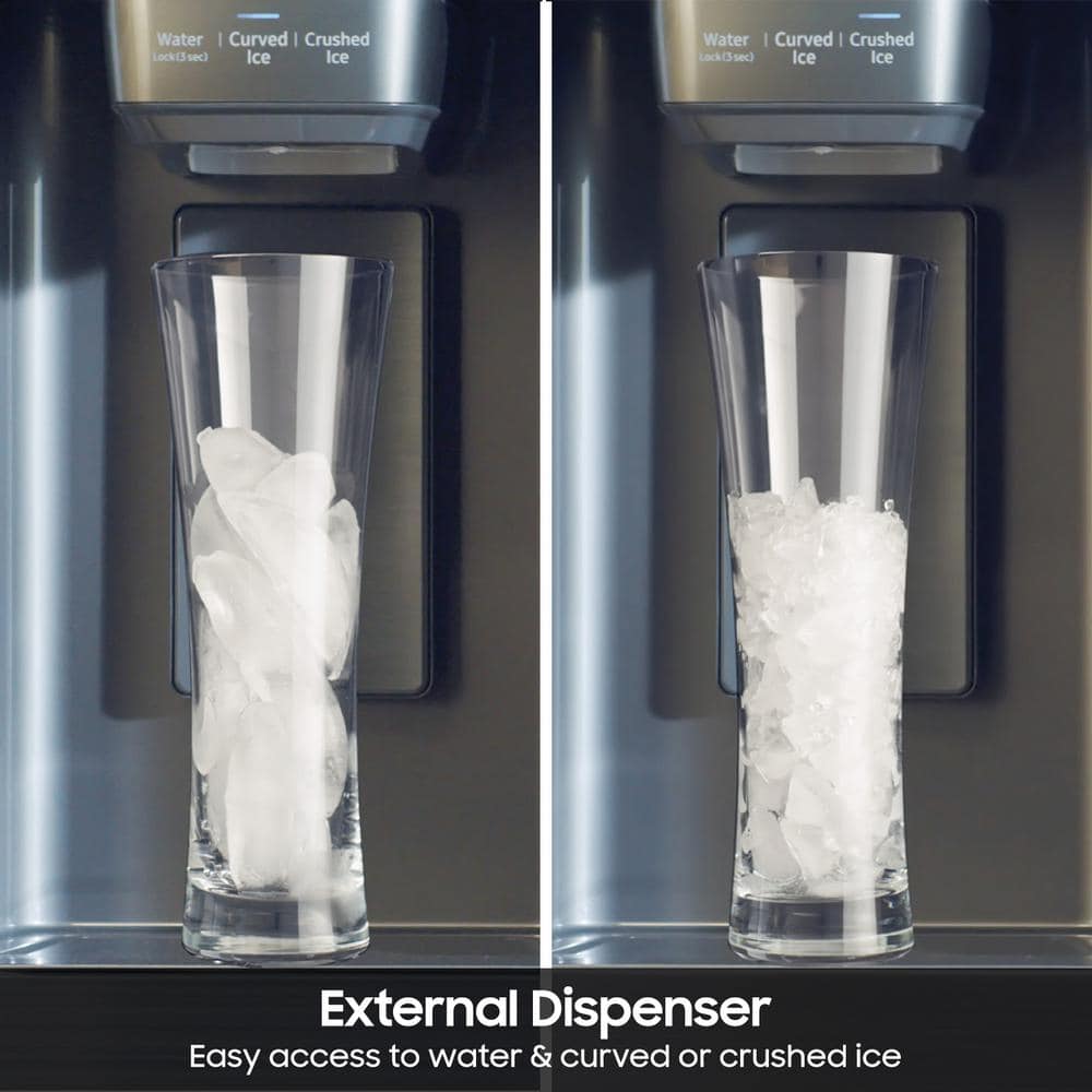 Samsung's 26 cu. ft. Mega Capacity Counter Depth, 3-Door French Door refrigerator has a modern design to blend seamlessly into your kitchen. Get extra space to store more groceries, including big and bulky items. Plus, get easy access to chilled, filtered water and curved or crushed ice with the external water and ice dispenser.