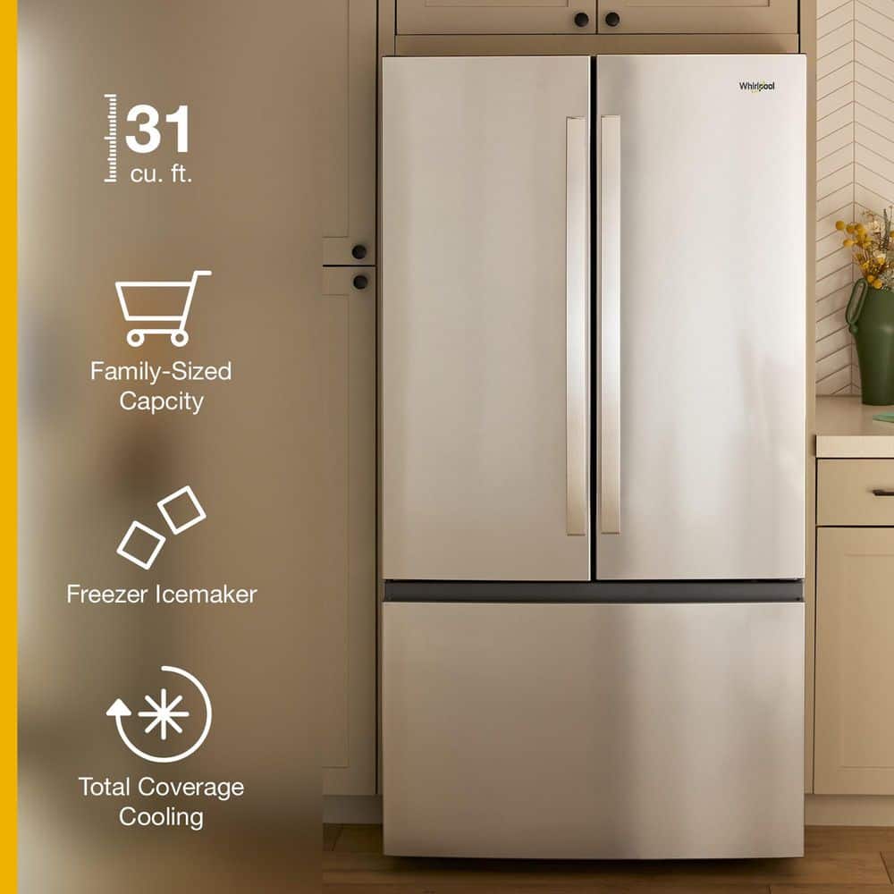Get Family-Sized capacity with the Whirlpool 31 cu. ft. French door refrigerator. Large Capacity Ice Production makes over 3 lbs of ice every day. Pint Size storage provides easy access to small items. And flexible storage with half and full Adjustable Glass Shelves.