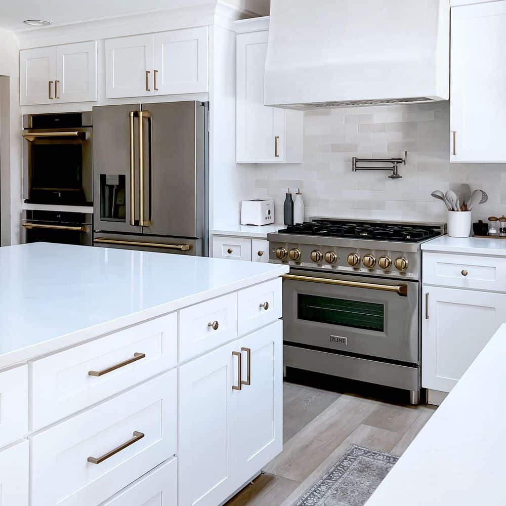- Sleek stainless steel with traditional Champagne Bronze handles