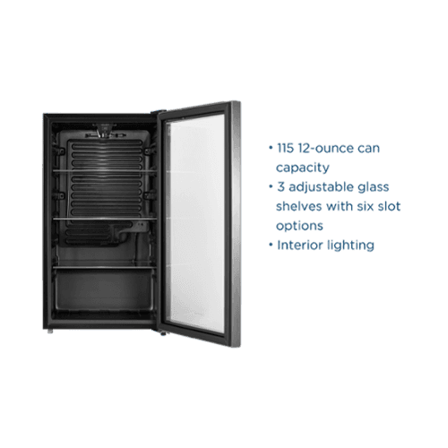 The Insignia 115 12-ounce can capacity beverage cooler is equipped with everything you need. Adjust to the ideal temperature with a dial control to ensure beverages are chilled to your liking. Organize your cooler with 3 adjustable shelves that fit into 6 available slots. Whether you're hosting a party, stocking up on drinks for your home bar, or looking to keep your favorite beverages within arm's reach, this beverage cooler is designed to offer ample space and convenience.