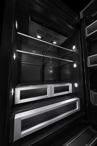 Featuring the exclusive Jenn-Air Obsidian interior, this bottom-freezer refrigerator offers a fully flush, fully integrated design, distinct fresh- and frozen-food climates, and Produce Preserver to help keep fruits and vegetables at optimum freshness.