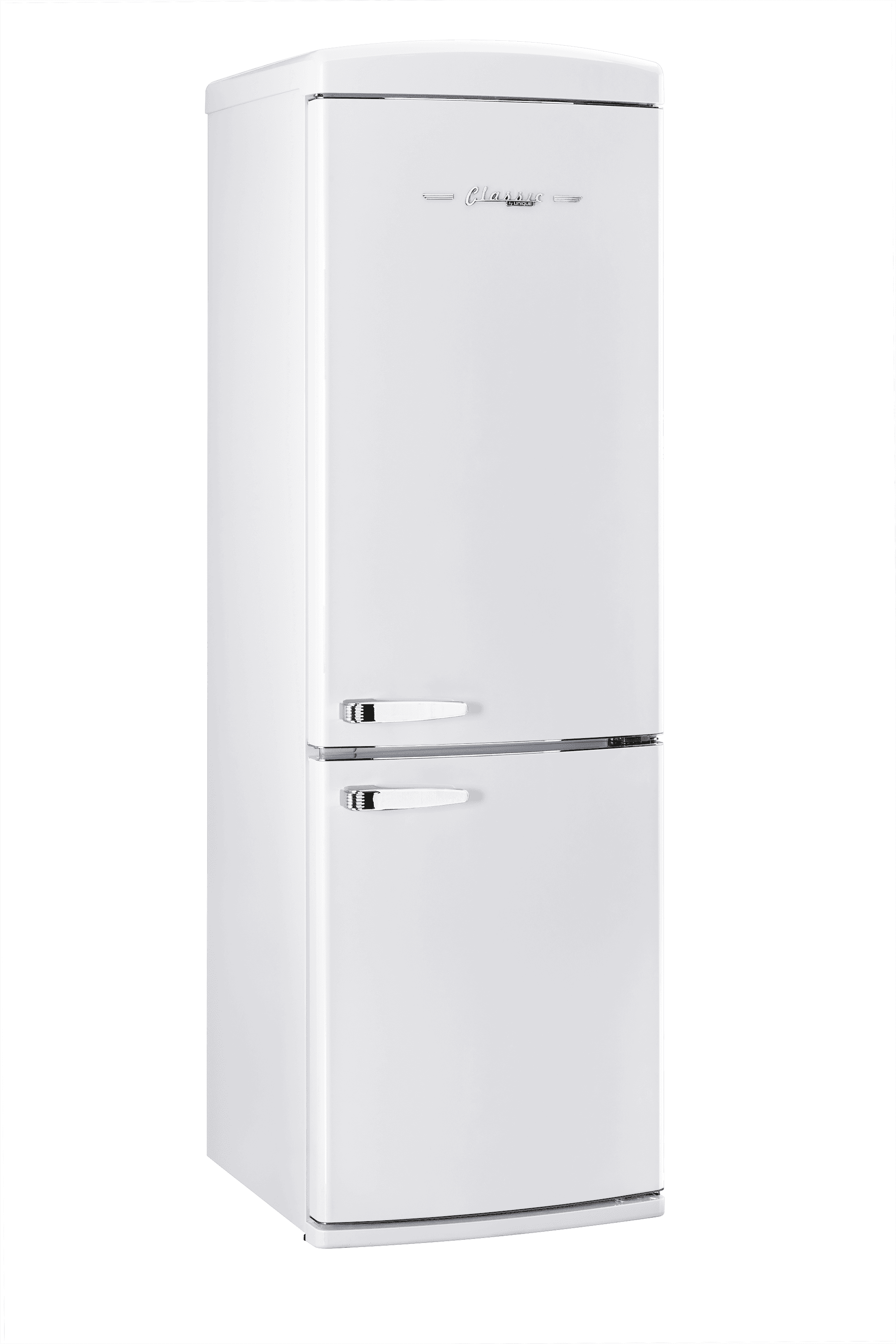 The 12 cu. ft. Classic Retro Bottom Mount Refrigerator by Unique blends timeless vintage style with modern efficiency. With iconic chrome accents and a retro design, this ENERGY STAR certified fridge offers energy savings all year long. Its frost-free technology eliminates defrosting hassles, while its spacious interior provides ample room for your groceries. The mechanical ice maker in the freezer ensures you always have ice on hand. Perfect for adding a nostalgic touch to your kitchen, garage, or finished basement, this stylish and functional fridge fits seamlessly into any space.