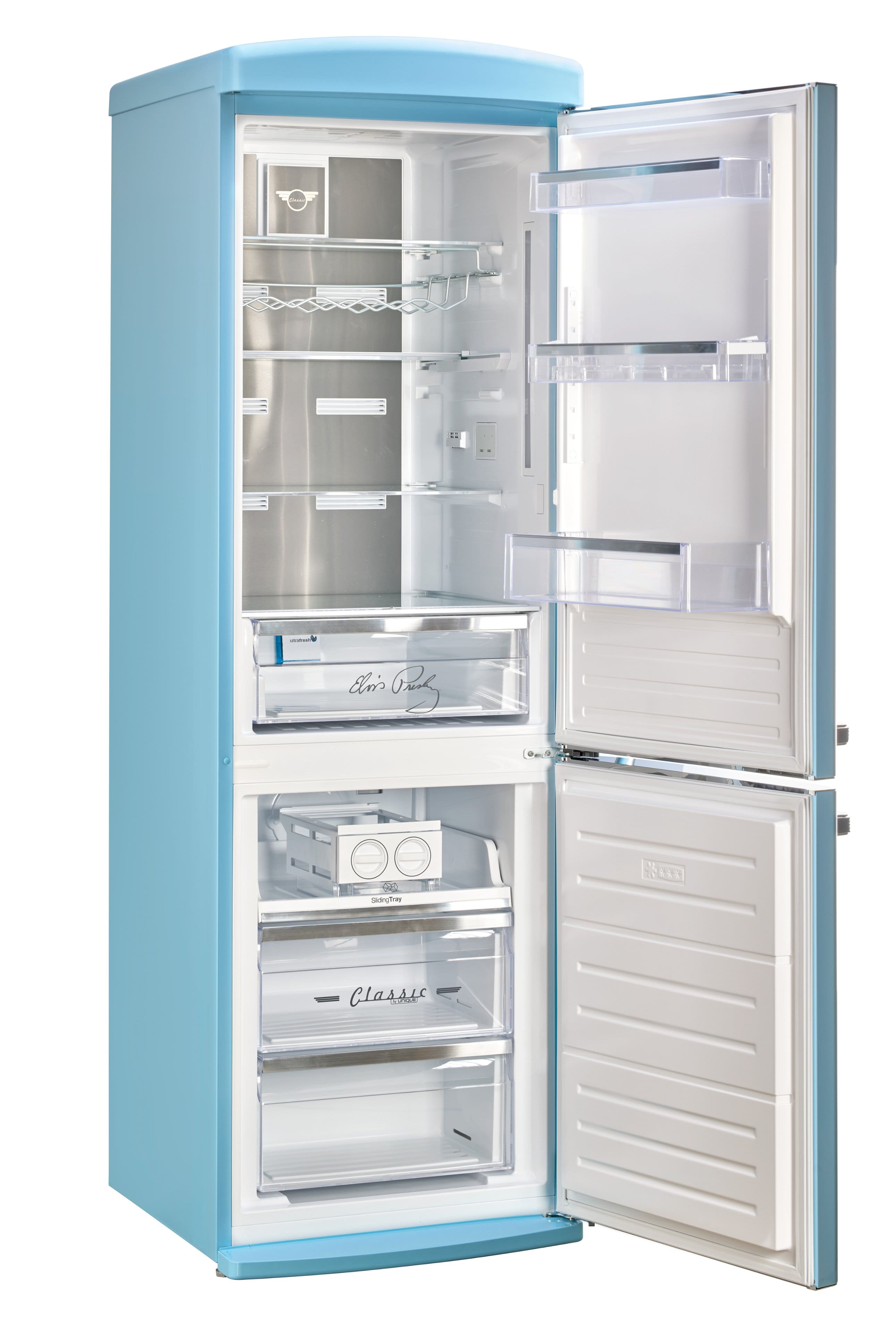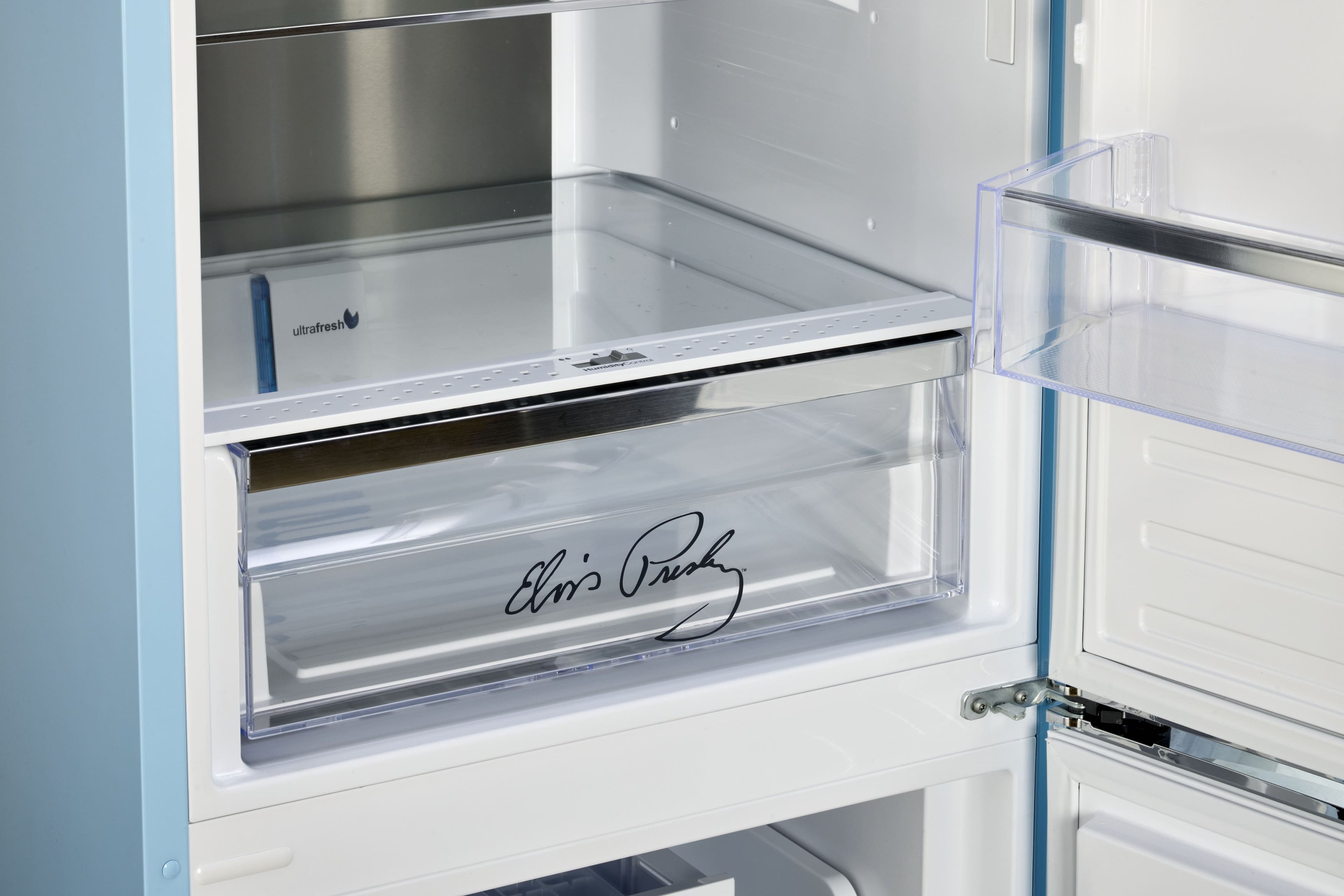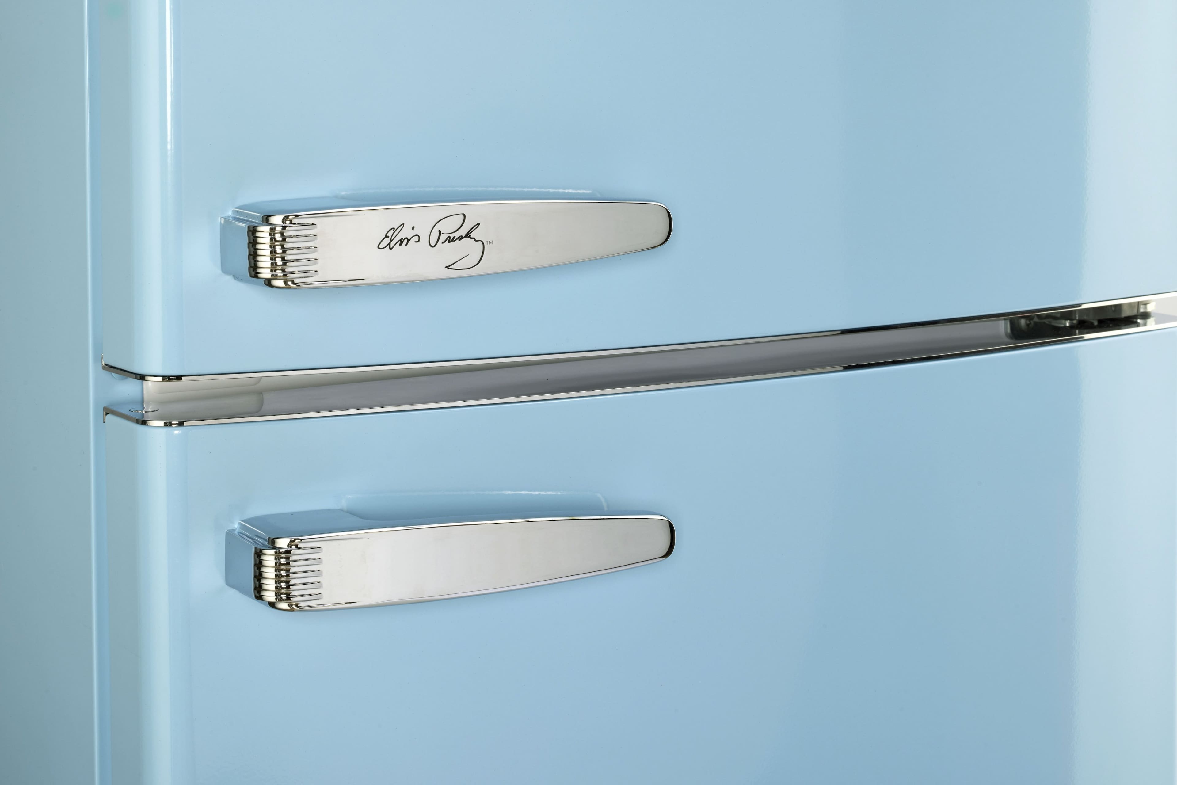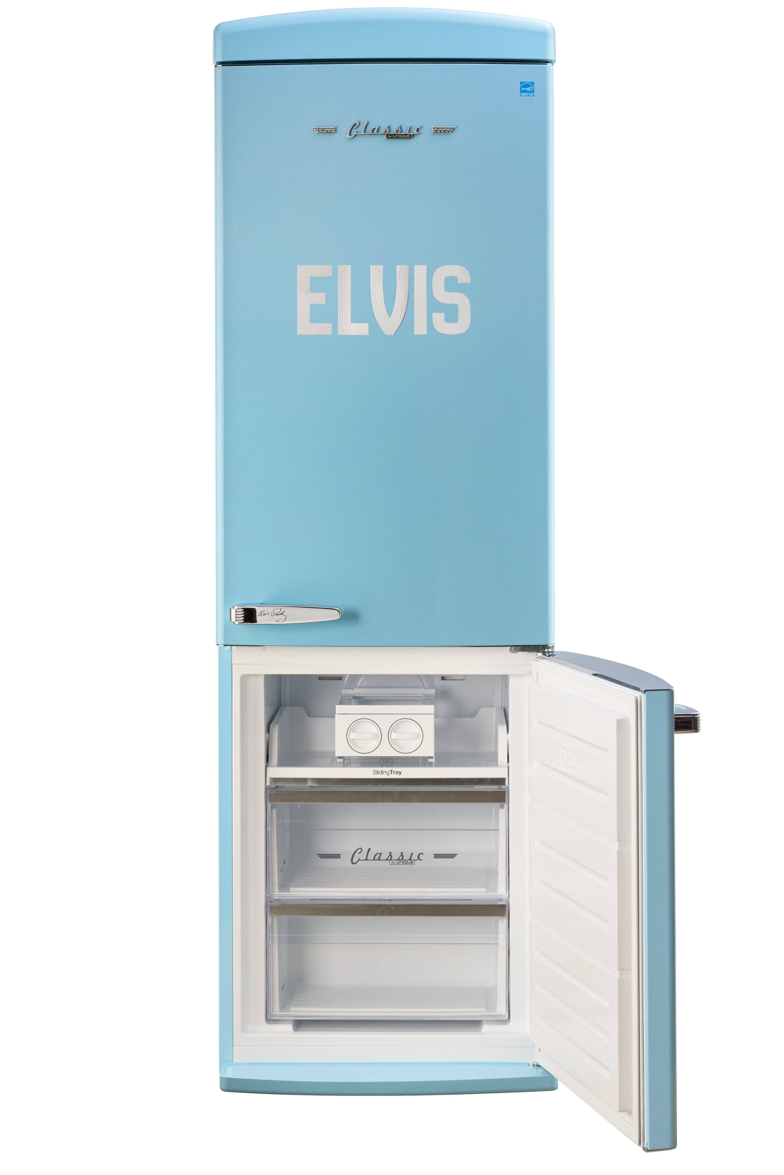 Celebrate the King with the Elvis Retro 12 cu. ft. Fridge in Blue Hawaii. Featuring vintage 50s style, Elvis-themed details, frost-free cooling, wine rack, LED controls & ENERGY STAR efficiency. Style meets function.