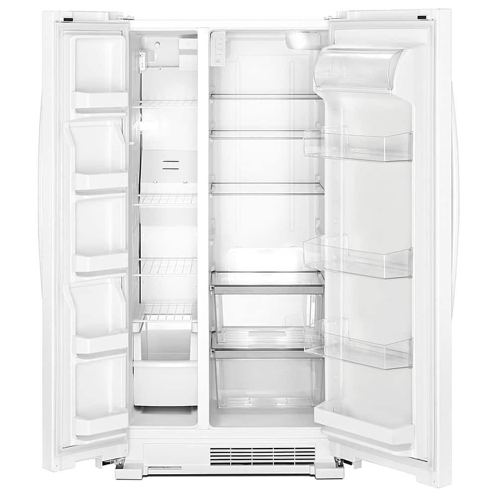 Keep your kitchen stocked with fresh food by using this 21.7 cu. ft. Whirlpool side-by-side refrigerator. It has adjustable door bins that fit gallon jugs, tall bottles and other large containers, saving space on the interior shelves. This energy-efficient Whirlpool side-by-side refrigerator has an intuitive temperature management system that prevents the compressor from running unnecessarily.