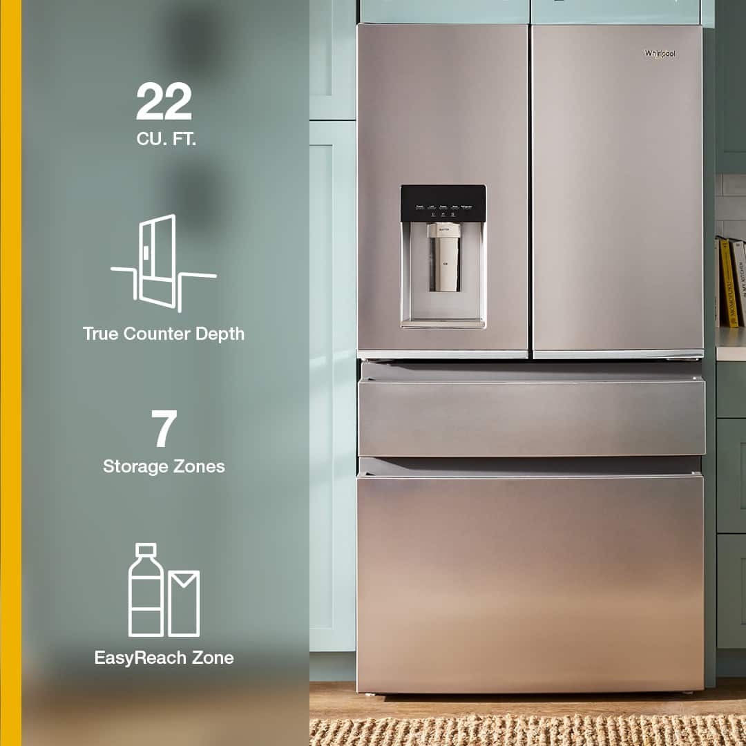 Maximize organization and minimize clutter with 7 organizational zones in this large capacity Whirlpool True Counter Depth French Door Refrigerator. Fill up quick with In-Door Filtered Water Dispenser & Ice Maker. Organize and access tall items like milk, juice and soda with EasyReach Zone, and See & store oversized produce with stacked EasyView Drawers.