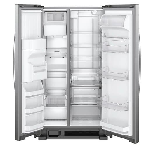 Store groceries and leftovers in this 35.5-inch Whirlpool side-by-side refrigerator. It has three adjustable glass shelves, so you can create your own configuration, and its humidity-controlled drawers keep your fruits and vegetables fresh and crisp. The stainless steel finish on this 24.55 cu. ft. Whirlpool side-by-side refrigerator protects it from fingerprints.