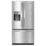 Stock plenty of fresh goods for the family with this 24.7 cu. ft. Whirlpool French-door refrigerator. It has two humidity-controlled crisper drawers to keep fruits and veggies organized, and its external water dispenser quickly satisfies your hydration needs. This 36-inch Whirlpool French-door refrigerator provides ample room for frozen favorites with its two-tier freezer storage.
