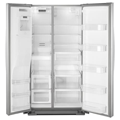 Find room for everything from produce to a gallon of milk in this Whirlpool side-by-side refrigerator. The sleek stainless design adds an instant update to your kitchen upgrade, and the in-door water and ice dispenser offers convenience. This Whirlpool side-by-side refrigerator has three adjustable full-width glass shelves for effortless setup of your storage.