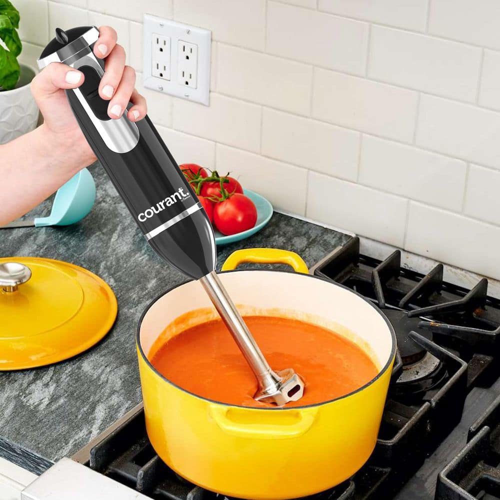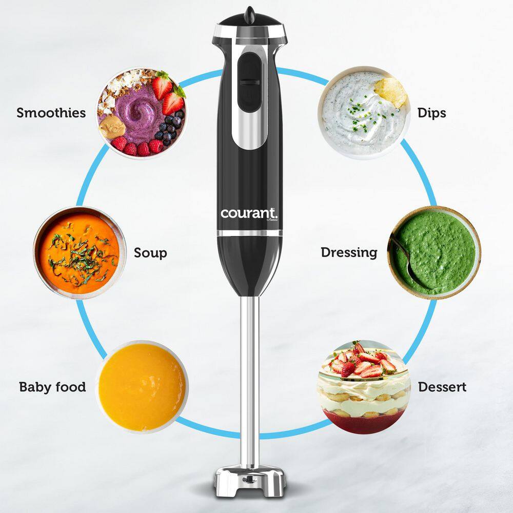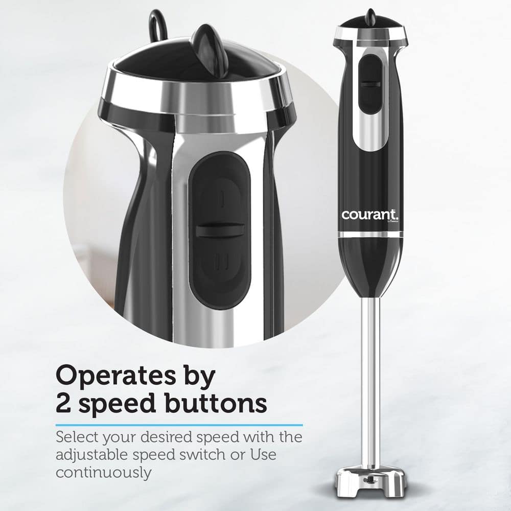 The Courant CHB-3503STK 350-Watt Multifunctional Hand Blender is the versatile kitchen tool that simplifies meal preparation and delivers precise, consistent results every time. Powered by a quiet 350-Watt DC motor, this hand blender effortlessly tackles blending, chopping, and pureeing tasks while maintaining a peaceful kitchen environment. Built with a durable stainless steel blending shaft, it stays sharp and strong, ensuring flawless blending whether you're working with hot soups or frozen fruits. The ergonomic comfort grip, enhanced with sleek chrome accents, provides both style and comfort, making long blending sessions feel effortless. Easy to clean and maintain, this hand blender is always ready for your next kitchen creation, making it your go-to tool for everyday cooking. The Courant CHB-3503STK is the perfect combination of power, precision, and convenience, bringing professional-level results to your home kitchen.