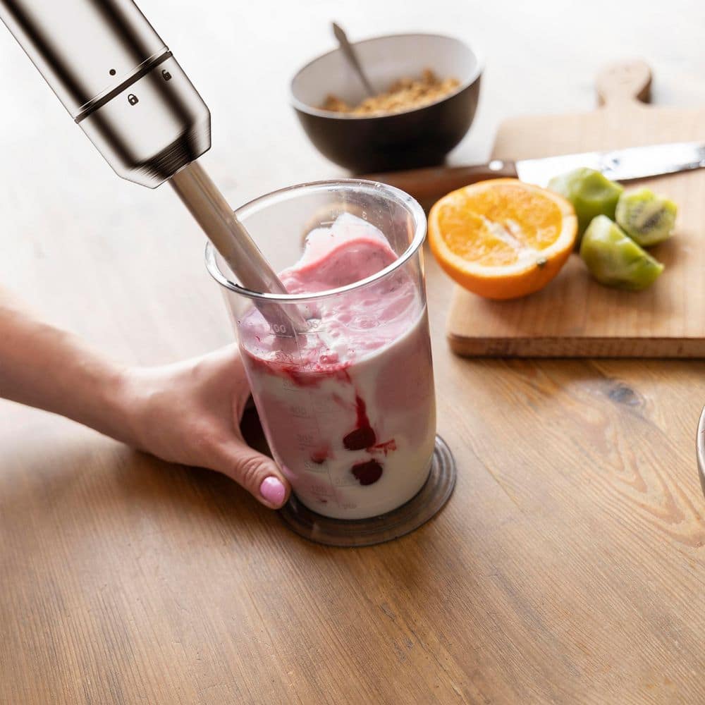 - Durable stainless steel blending shaft for consistent results