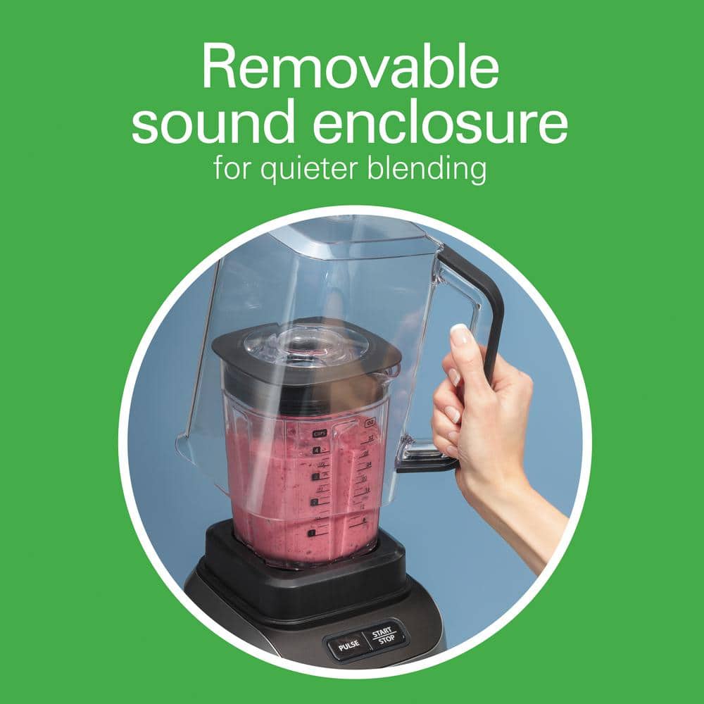 Increase your blending power while reducing noise with the HAMILTON BEACH PROFESSIONAL Quiet Blender. The 2.0 peak horsepower motor powers stainless steel blades to speeds over 105 mph to blast through ice, frozen fruit, and other tough ingredients in just seconds. With rubber-mounted components, a motor designed with optimal air flow and a removable shield, this blender is significantly quieter than leading competitors. The quiet shield can also be used as a serving pitcher. Effortlessly create perfectly blended smoothies, juice whole fruits and vegetables, puree hot soups, emulsify dressings and grind spreads. With a variable speed dial, you control the blending to achieve restaurant quality results every time. Or choose pre-programmed smoothie, ice crush or puree settings for one-touch convenience. A tamper is included to help blend thick or frozen mixtures. The clean setting makes washing your jar a breeze, and all parts are dishwasher safe.
