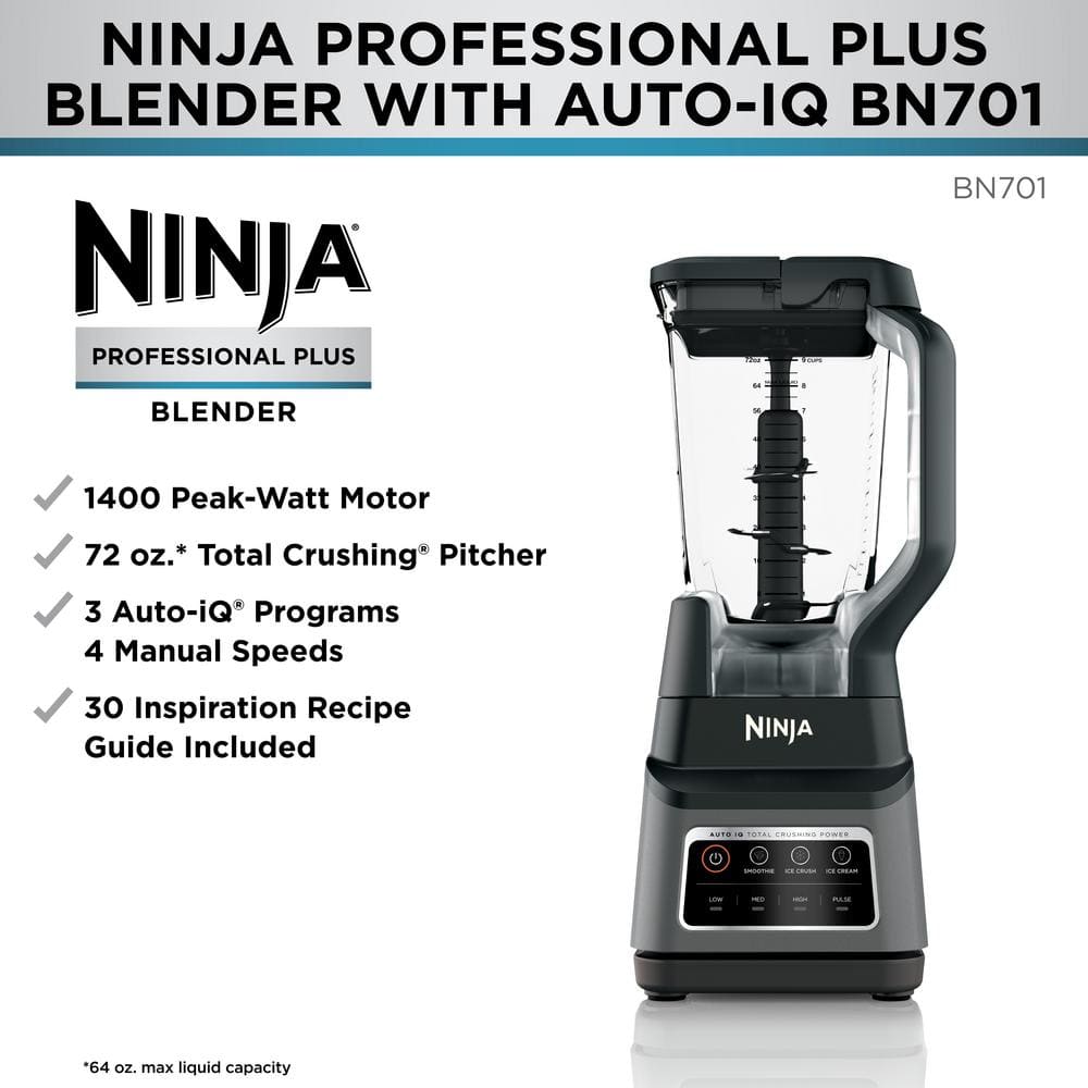 The Ninja Professional Plus Blender with Auto-iQ features a new modern design and a more powerful motor than Ninja's original Professional Blender. Ninja Total Crushing Blades give you perfectly crushed ice for your smoothies, frozen drinks, and ice cream. The 72 oz. Total Crushing Pitcher is great for making large batches for the whole family with 1400 peak watts of professional power. Auto-iQ Technology provides preset programs that do the work for you, no guesswork required. *Versus BL610, based on operating wattage 64 oz. max liquid capacity