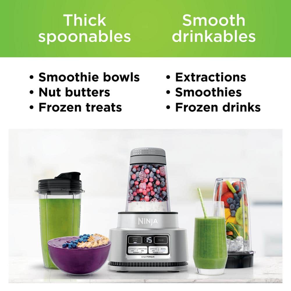 Ninja Foodi Smoothie Bowl Maker and Nutrient Extractor with smartTORQUE is designed to blend and power through the thickest ingredients at high speed and never stall. 1-base with multi-functions. The Ninja Nutrient Extraction Cup and Spout Lid for smoothies and extractions. The Smoothie Bowl Maker with built-in tamper powers through frozen foods with less liquid for thick smoothie bowls and nut butters. 1200-peak-Watt power-dense motor.