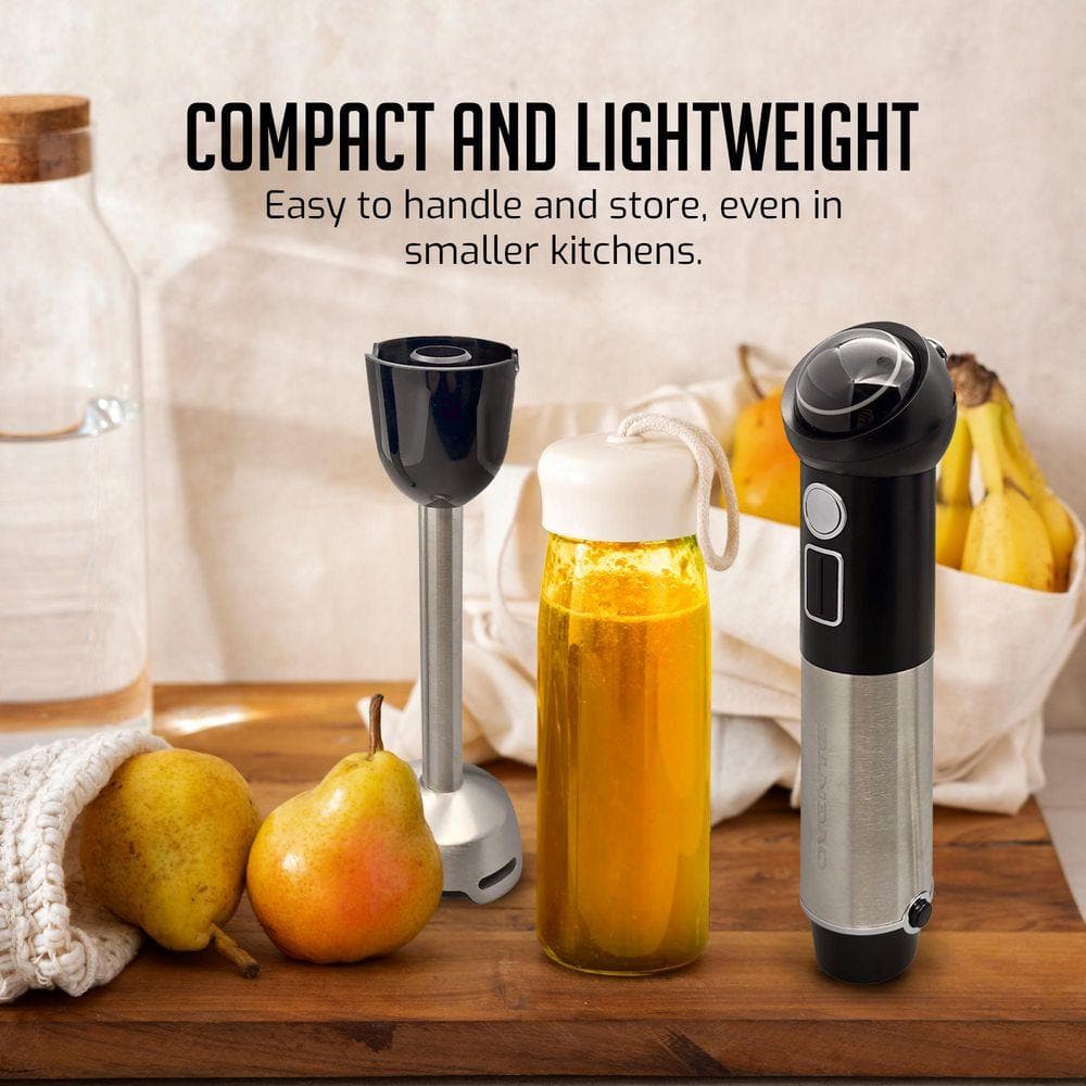 Introducing the OVENTE Cordless Hand Blender HR995 Series - your ultimate kitchen companion. Say goodbye to tangled cords and enjoy the freedom to blend wherever you are. Simply charge the blender, and it's ready to go whenever you need it The ergonomic handle ensures a comfortable grip, giving you full control over your blending. With the speed pulse activating sensor, you can easily adjust the speed for everything from salsas and shakes to smoothies and more. Not only does this blender provide a smooth, effortless blending experience, but it also adds a sleek, modern touch to your kitchen. Cleaning is a breeze with the detachable stainless-steel mixing shaft, making it easy to wash after every use. Whether you're pureeing soups directly in the pot or whipping up frozen treats, this immersion blender is up for the task. Powered by a 300-Watt motor, the OVENTE Hand Blender HR995 Series tackles all your blending needs efficiently. Plus, its rechargeable, so you can blend hassle-free anytime, anywhere. Elevate your blending experience with the OVENTE Cordless Rechargeable Hand Blender HR995 Series - the perfect combination of performance, convenience and style.
