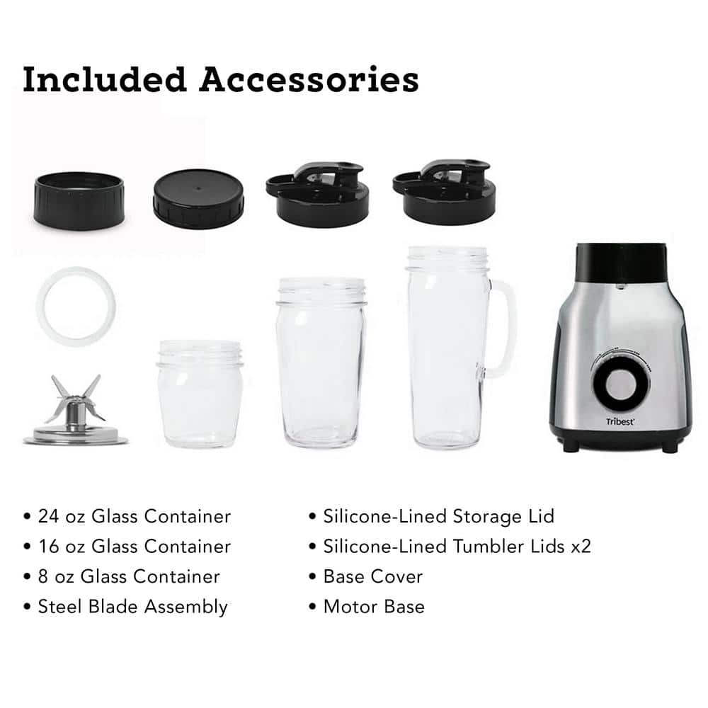 The Tribest Glass Personal Blender is an electric blending appliance that makes clean personal jar blending easy and portable. The all stainless-steel blade assembly and tempered glass containers ensure that there is zero food contact with plastic. Worry no more about plasticizers, BPA, or harmful chemicals leaching into your favorite recipes for smoothies, sauces, baby food and more. The Variable Speed Dial gives you total control over the final result and the 1-Touch Pulse Button is convenient for achieving the perfect blend. Store your blends in the Tempered Glass Blending Containers, or take them with you using the Tumbler Sipping Lids. An optional, large-size 42 oz. blending container turns your Personal Blender into a full size blending machine for your larger recipes and comes outfitted for vacuum blending, further enhancing your blends taste, texture, shelf life and nutritional quality. The Glass Personal Blender is the best a blender can offer, with its compact size, powerful motor and clean, plastic-free blending environment.