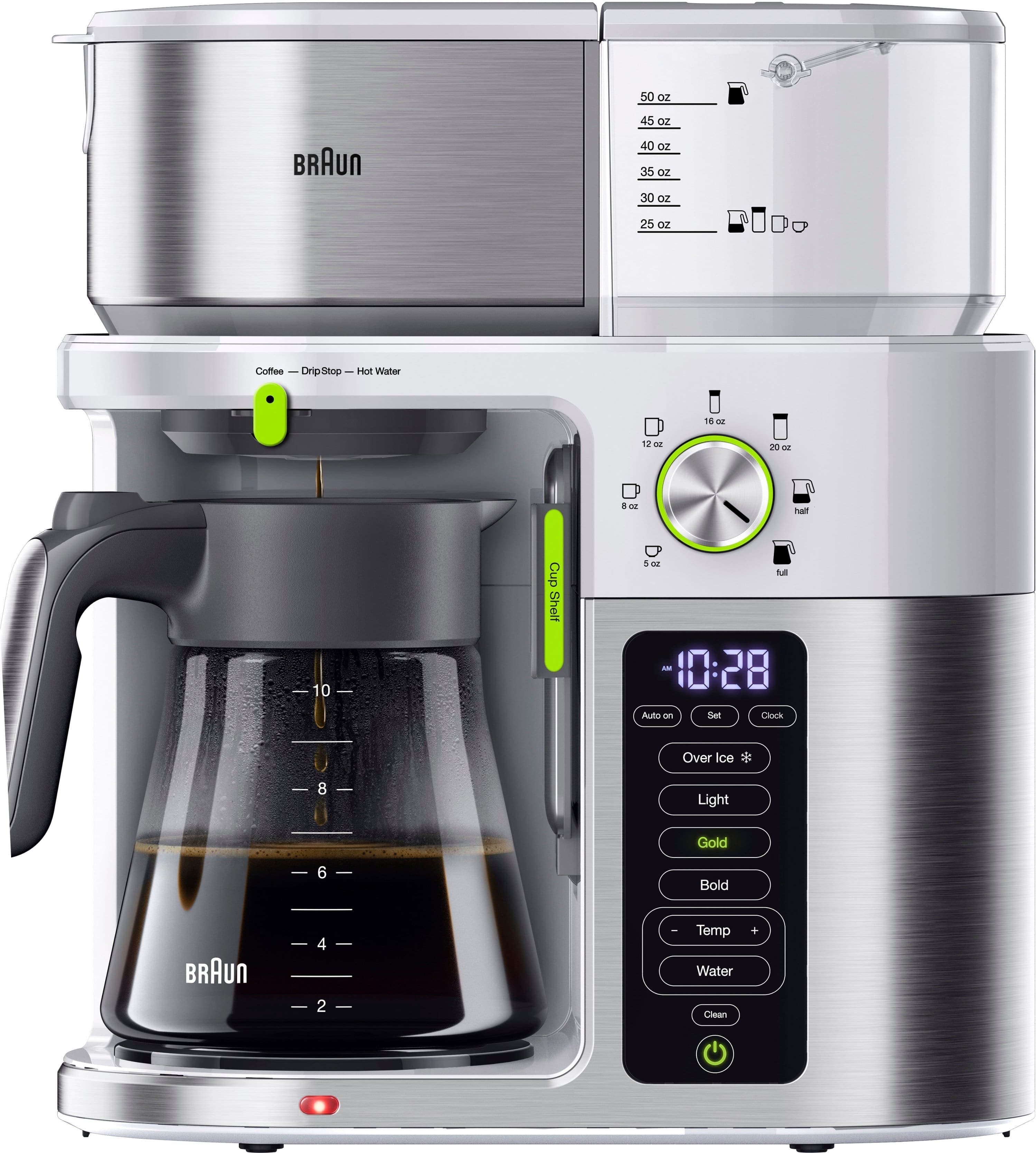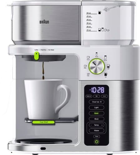 With a longstanding history of crafting quality coffee machines, the Braun MultiServe Coffee Maker represents the next evolution in drip coffee. From single-serve to multi-serve and everything in between, the Braun MultiServe easily adapts to your ever changing needs and coffee preferences. Our ExactBrew System delivers consistent, optimal brewing with every cup, automatically calculating the precise water flow, temperature and speed. With the touch of a button, BrewChoice Plus lets you customize your coffee to your liking, from light to bold - even iced. Certified as a Golden Cup by the Specialty Coffee Association, you’re guaranteed great tasting drip coffee, however you prefer it. A convenient MultiServe Dial System also makes it easy to brew as much or as little as you need, ranging from a pod-free single cup to full carafe, which is delivered in less than 8 minutes without sacrificing taste. Plus, always know your brewed coffee is fresh with a visible Freshness Indicator display. There's even a seperate water spout for hot water, so you can enjoy fresh brewed tea without the coffee taste. Sleek and streamlined with a stainless steel and black accent design, the Braun MultiServe Coffee Maker offers the convenience and versatility you crave, while never compromising the quality of your brew. It’s drip coffee, evolved.