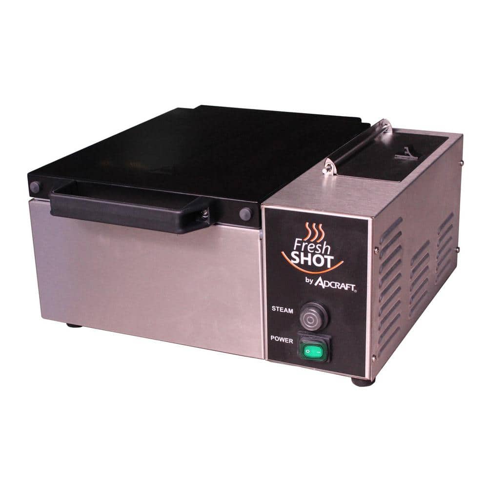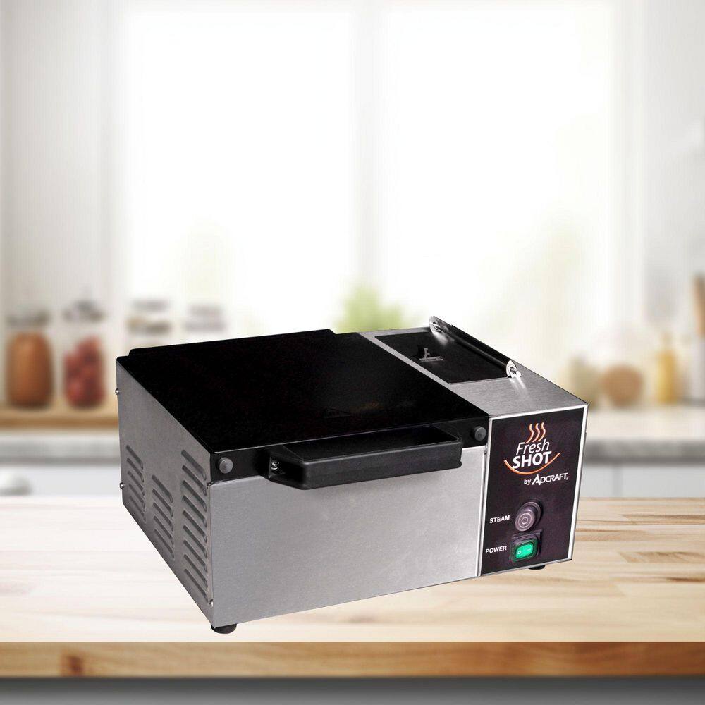 The Adcraft Fresh Shot Countertop Steamer in stainless-steel keeps tortillas, pitas, bread items and hotter and fresher with the push of a button. The compact steamer fits any countertop, and it is a perfect addition to any commercial kitchen. Accommodating 1 half-size pan, the easy-to-use, push-button operation provides a quick shot of heat in seconds that instantly warms up your food. Sturdy stainless-steel construction is designed for heavy-duty, long-term use, and the cast aluminum interior conducts heat evenly and thoroughly. The self-contained water reservoir holds up to three quarts of water and allows for easy filling and disposing of water with no water line hook-up needed. This tabletop steamer includes a stainless-steel, perforated half pan, an on/Off rocker switch, and a 4-foot power cord with an NEMA 5-15 plug. Non-slip rubber feet provide stability, and the Bakelite is cool to the touch. Overall dimensions are 22 in. W x 17.25 in. D x 8.5 in. H. NSF and CE Certified. The Adcraft Fresh Shot Countertop Steamer's compact design, ease of use and versatility make it a valuable addition to your commercial kitchen. Covered by the Adcraft 1-Year Limited Warranty.