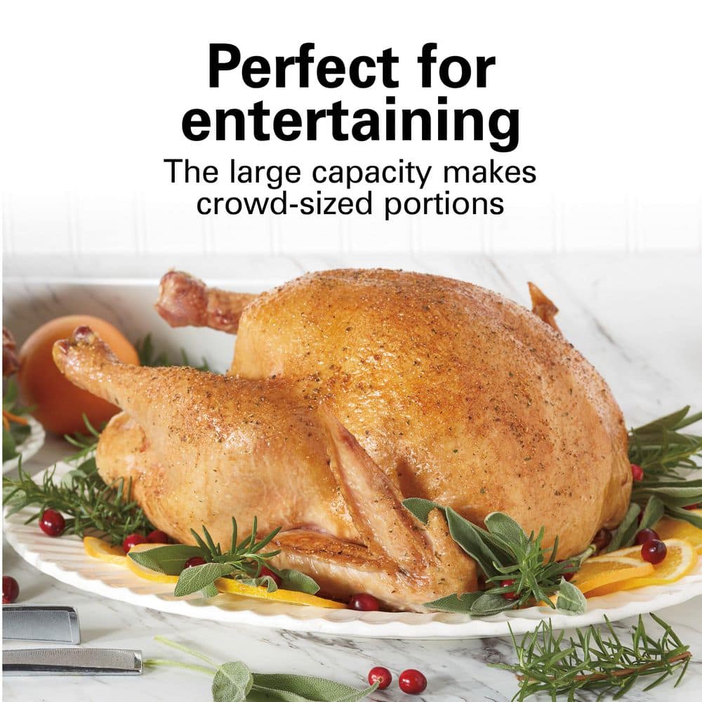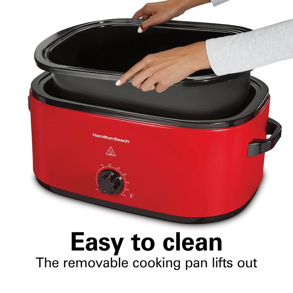The versatile 22 quart Hamilton Beach Electric Roaster Oven is perfect for holidays and special occasions because it easily adds extra oven space in the kitchen when you need it. The roaster oven doubles your oven space and provides excellent results meal after meal. It holds a 28 lb. turkey and is great for cooking large meats, but you can also use it to steam vegetables, bake potatoes and even make cheesecake. This versatile roaster oven steams, slow cooks, roasts, and keeps food warm for serving guests. You can easily adjust the temperature from 125° to 450° F with one simple knob to perfectly cook a variety of foods and keep them warm until serving time. The included lift-out rack makes it easy to lift large meats like turkey and baked ham from the roaster oven, and the removable cooking pan lifts out for easy cleaning.