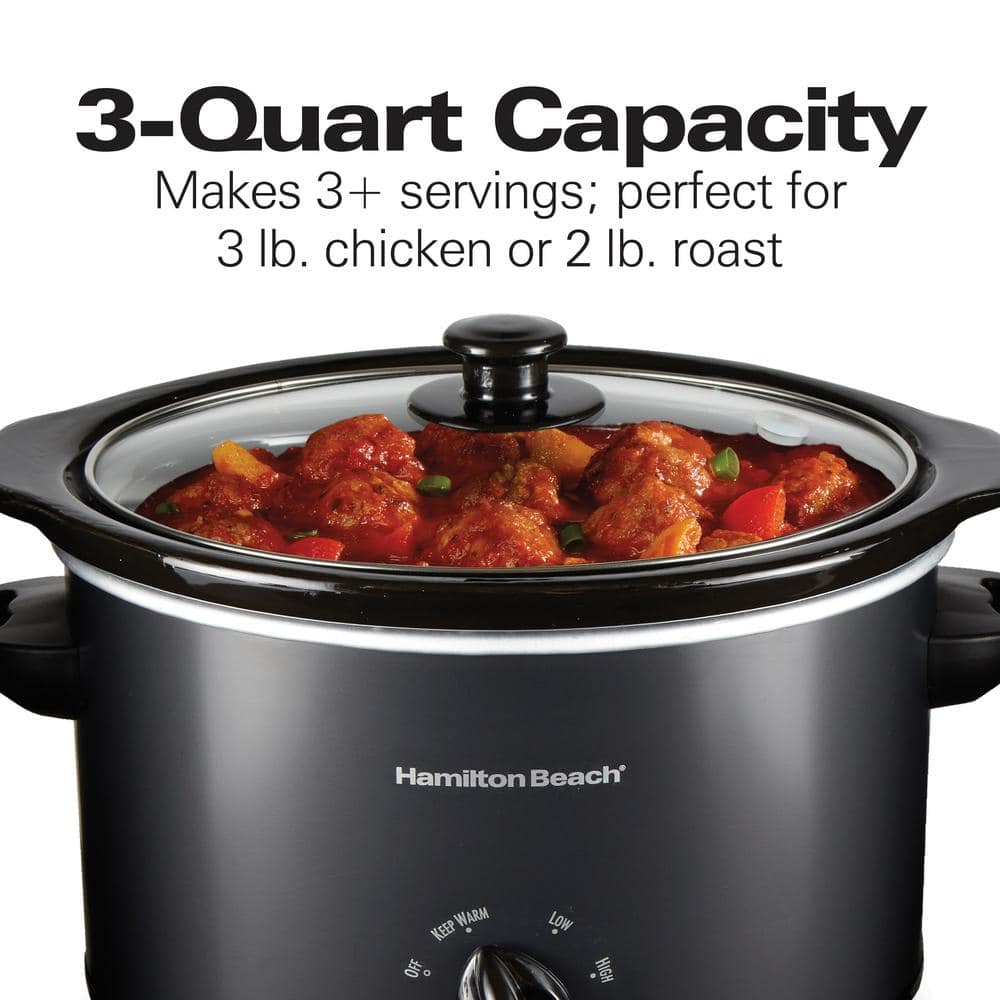 Eliminate mealtime stress with the convenient Hamilton Beach Slow Cooker, which cooks delicious foods while you go about your routine. And with a beautiful black finish, it will look great on the countertop or kitchen table. Meals practically make themselves; simply add your ingredients, choose between the low or high settings, and let the slow cooker do the rest. When cooking is complete, switch to the keep warm feature to maintain the ideal temperature until you're ready to eat. After dinner, the removable stoneware crock and tempered-glass lid go in the dishwasher for easy cleanup. Makes 3+ servings; perfect for 3 lbs. chicken or 2 lbs. roast.