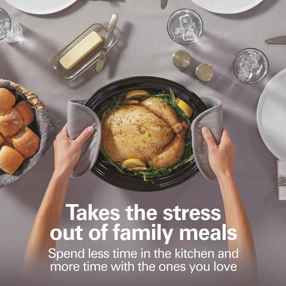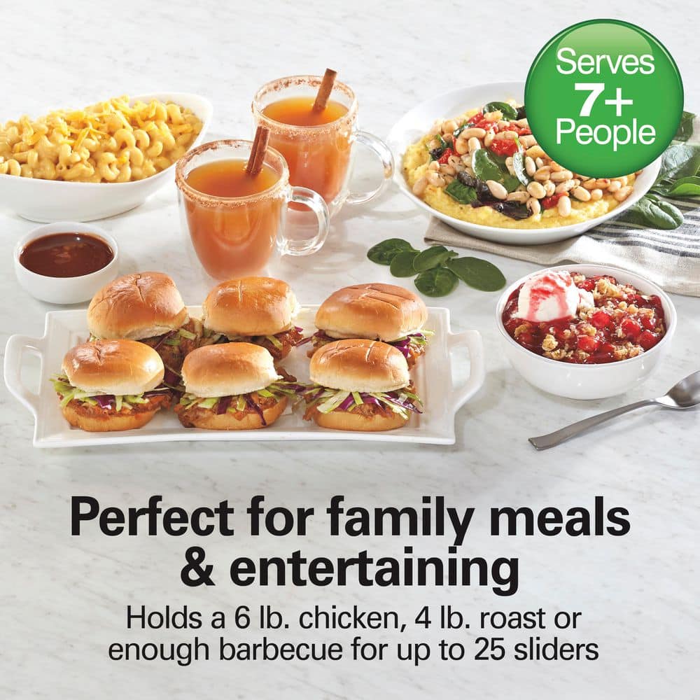 Getting dinner on the table just got a whole lot easier. With the Hamilton Beach 6 qt. Slow Cooker with Folding Handles, there's nothing complicated to figure out. Just add your ingredients and turn the dial to choose your heat setting. You'll get great results without spending a lot of time in the kitchen. The unique folding handles are easy to grasp when carrying food to the table, or fold the handles down for compact storage or to make more space on the countertop. This slow cooker has a 6 qt. capacity that serves 7+ people and will hold a 6 lb. chicken, 4 lb. roast or enough barbecue to make up to 25 sliders. The slow cooker is convenient for cooking easy one-pot meals like chili, pot roast and lasagna, main dishes, side dishes, appetizers and homemade desserts like chocolate lava cake and fruit cobblers. After cooking your meal on Low or High, simply turn the dial to the Keep Warm setting to keep food warm until it's time to eat. The removable stoneware crock and glass lid are dishwasher safe. The slow cooker is backed by Hamilton Beach with a 1-year limited warranty.