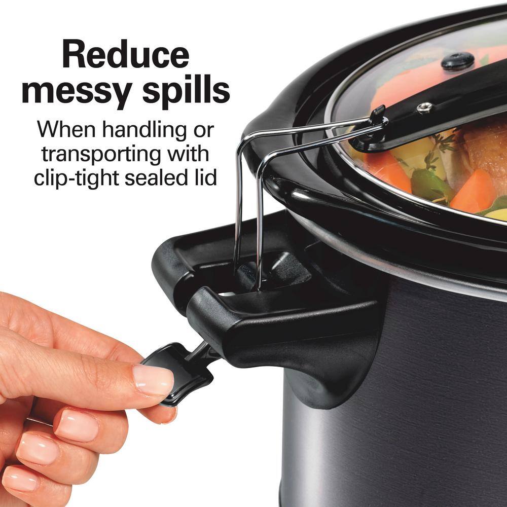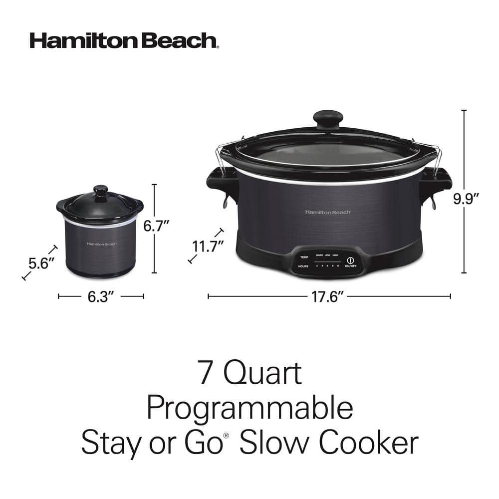 The Hamilton Beach 7 Quart Programmable Stay or Go Slow Cooker is the versatile go-to slow cooker that lets you cook all your family's favorite meals then easily them to family get-togethers and parties. The built-in clips hold the lid in place to prevent messy spills when handling the slow cooker or transporting food in your car. Mix and match warm, low or high heat settings with 5 cooking times ? 2, 4, 6, 8 or 10 hours ? for a total of 15 programmable cooking options. After cooking is complete, the slow cooker automatically switches to warm so you can set it and forget it. The slow cooker will hold a 7 lb. chicken, 5 lb. roast or enough barbecue for up to 30 sliders. It serves 8+ people and is perfect for family gatherings and entertaining. Cook one-pot meals like lasagna, homemade chili, beef stew and macaroni and cheese, or make meatball appetizers, vegetable side dishes and desserts like chocolate lava cake. The slow cooker includes a Party Dipper? food warmer that's the perfect size for dips and appetizers. The removable stoneware crock and glass lid are both dishwasher safe for easy cleanup.