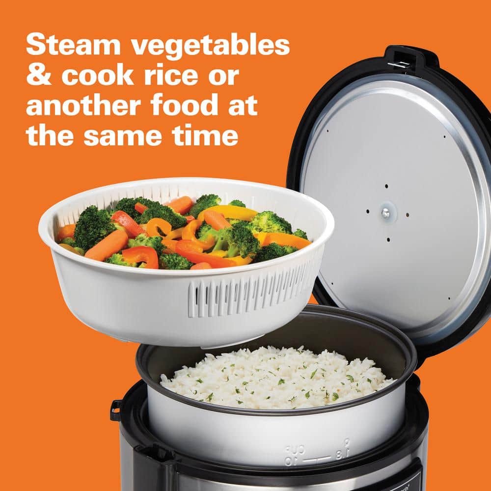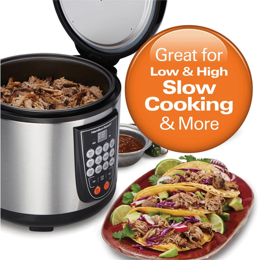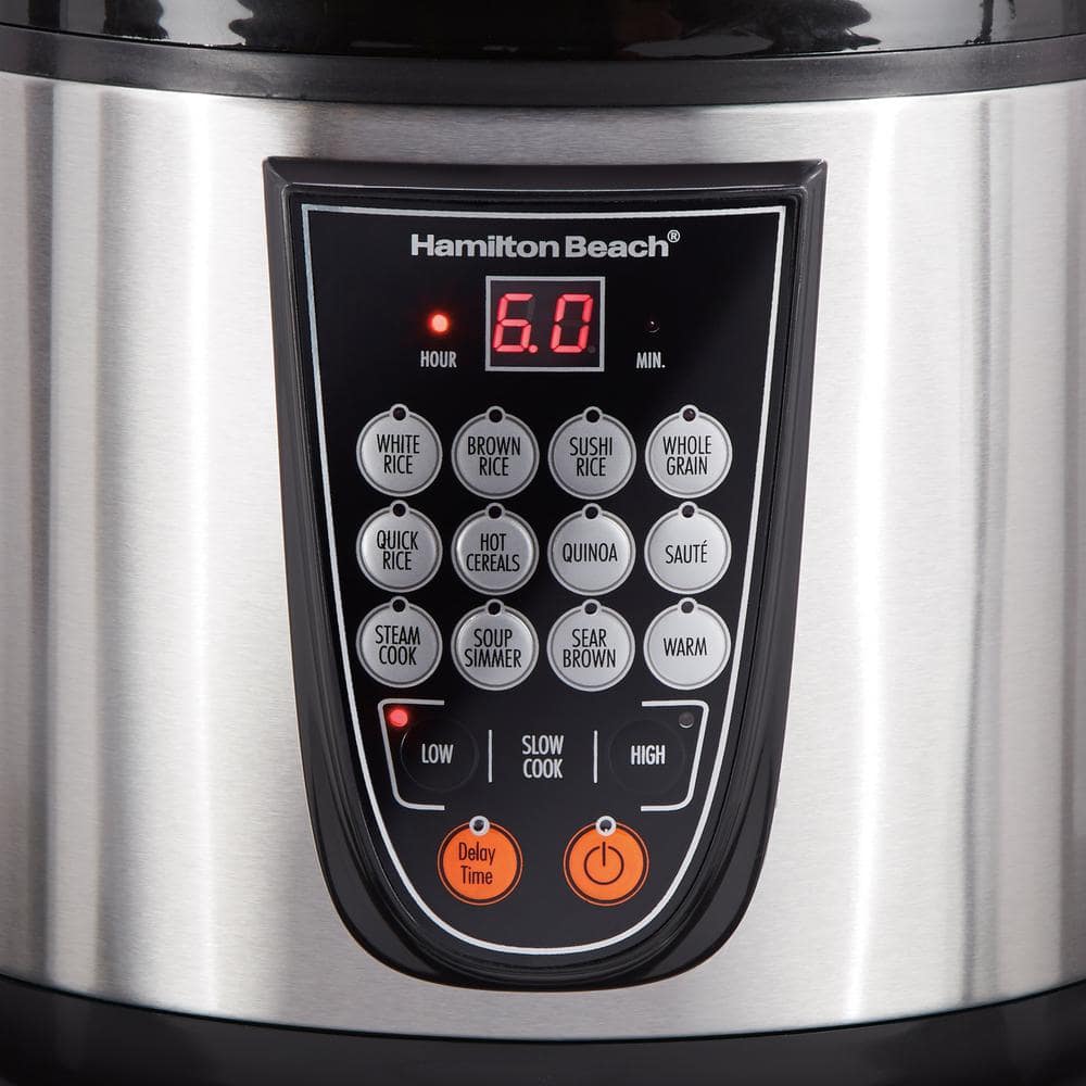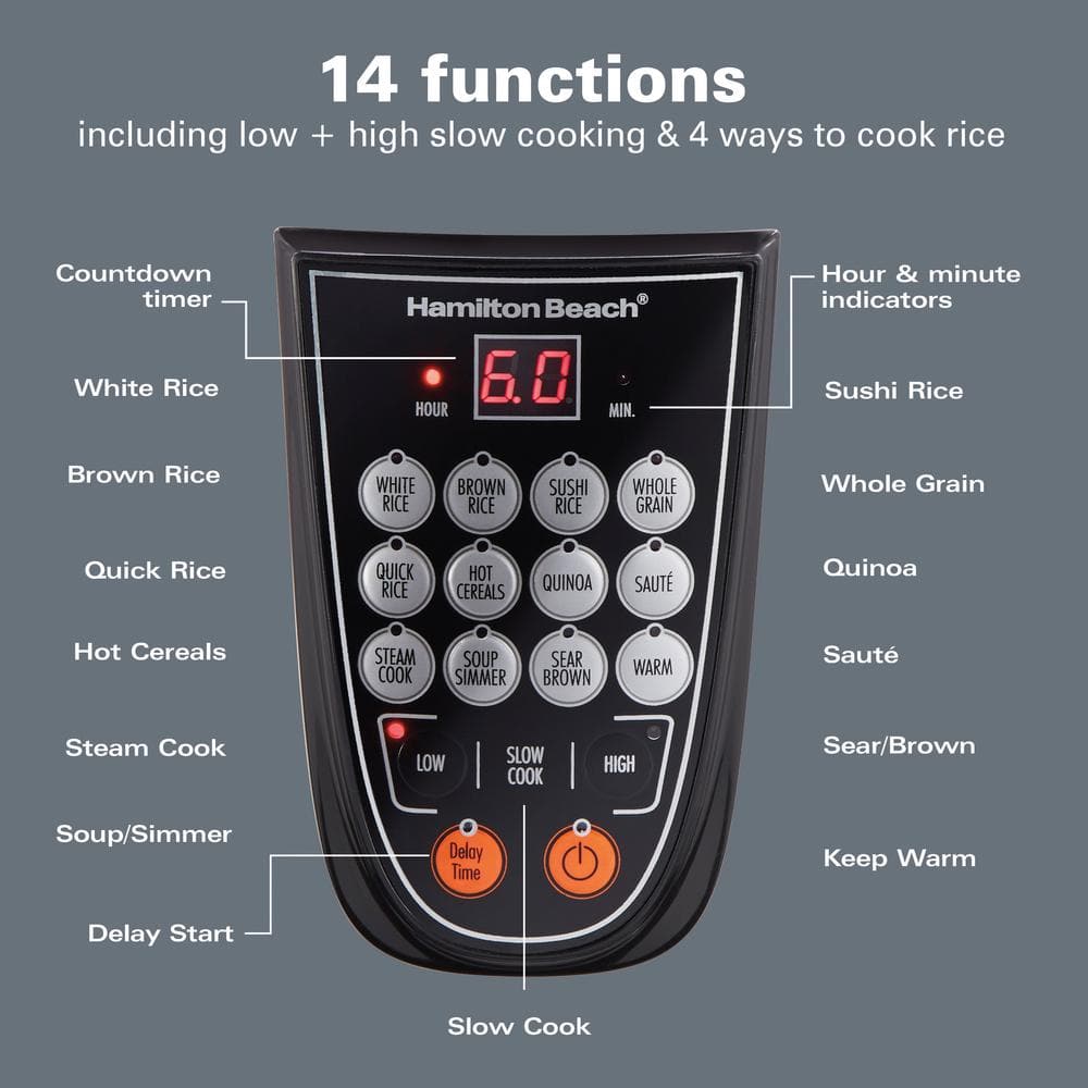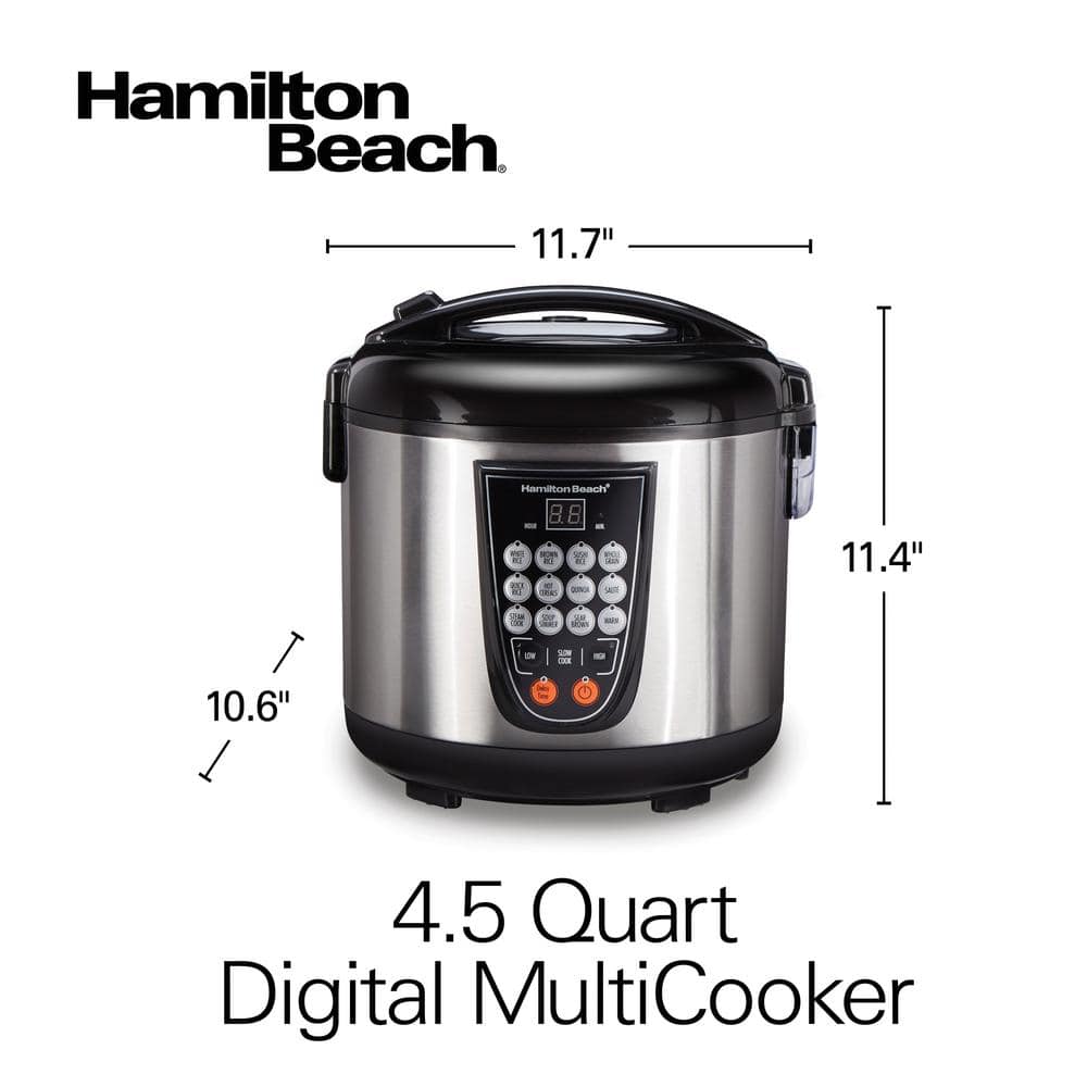 One cooker, endless possibilities. Save storage space and enjoy maximum cooking versatility with the Hamilton Beach Digital MultiCooker. With a 4.5 quart capacity, this multi-purpose cooker combines the functions of a rice cooker, slow cooker, food steamer and more into one compact appliance. Intuitive push-button controls make switching between cooking methods effortless. A delayed start option on select features and programmable timer allow even more flexibility. One-Pot Cooking Make a complete dinner in one cooking cycle. With 14 pre-programmed settings, you can slow cook, prepare rice, steam, saute, sear, simmer and more in the same pot. A 4.5 quart capacity - or 20 cups of cooked rice - means you can make enough for the whole family. 14 Pre-Programmed Settings Create a variety of meals from breakfast to dinner with the push of a button. Fourteen pre-programmed settings include a keep warm function and delay start, so you can prepare meals for cooking up to 15 hours in advance. Make Easy Rice, Grains and Hot Cereal Individual cook options make it easy to prepare white rice, brown rice, sushi rice, whole grains, quinoa, and hot cereals like oatmeal, grits and more. Steam Up Healthy Meals Steam seafood, poultry or vegetables in the steam basket while rice or grains cook below, or steam them on their own. Slow Cook on Low and High Double your countertop space by using a multifunction cooker as a slow cooker.