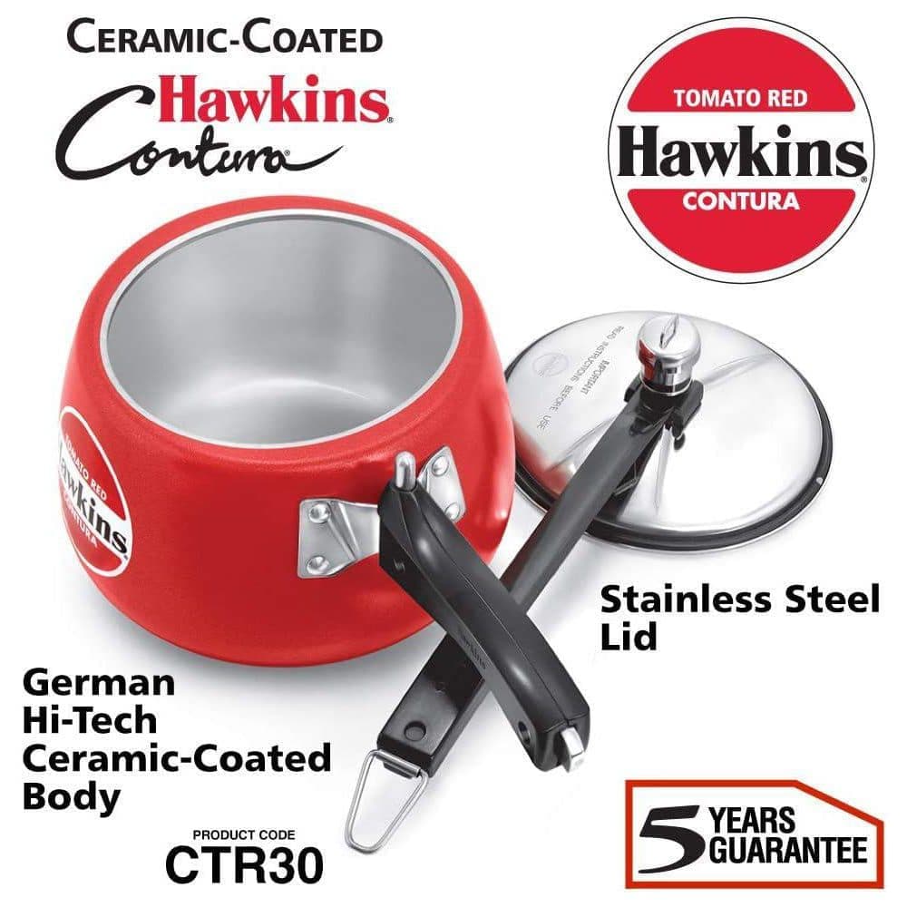 The Ceramic-Coated Hawkins Contura features a non-toxic ceramic coating on the exterior of the cooker body, which provides scratch and stain resistance. The mouth of the cooker body boasts a metallic rim for safety. The black base of the cooker ensures rapid heating for efficient cooking. Its unique curved body, facilitates easier stirring, improved visibility, and effortless removal of food. The stainless steel lid complements the ceramic-coated body, ensuring durability and safety. The inside-fitting lid enhances safety by pressure-locking, similar to the mechanism on a jetliner door. The improved pressure regulator not only ensures efficient cooking but also contributes to fuel savings. The valve strategically is placed under the lid handle bar to deflect steam safely downwards in case of operation. The gasket, with minimal steam exposure, lasts longer. Stay-cool handles with a sturdy pivot ensure durability. Recommended for gas stoves, this cooker is a reliable kitchen essential.