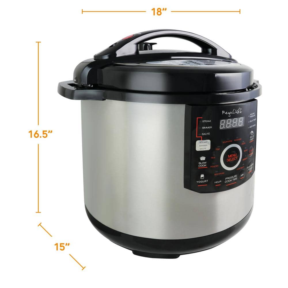 Mega chef 12 Qt. Digital Pressure Cooker with 15 Presets is sure to become your favorite kitchen sidekick. This versatile kitchen appliance will serve you well in those busy times when you need a hot homemade meal to serve without the hours it takes to prepare. You'll love how easily you can produce the best possible results with succulent and delectable dishes. With this pressure cooker you also have the option to cook using the slow cook function for up to 9.5 hours. That means some of the heartiest stews and chilies your guests have ever tried, and they're all prepared by you from scratch. Cooking under pressure allows you to cut the cooking time up to 70% and that means you have more free time to really enjoy the things you'd love to make more time for.