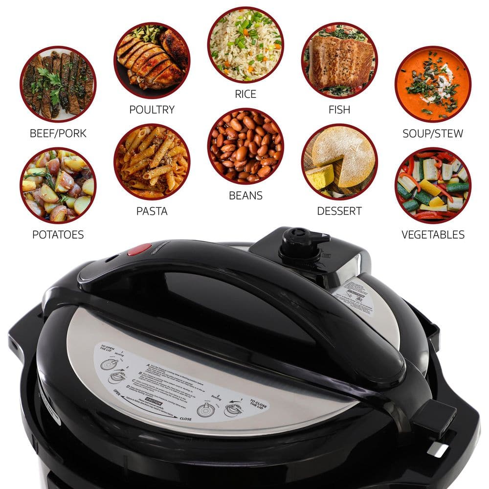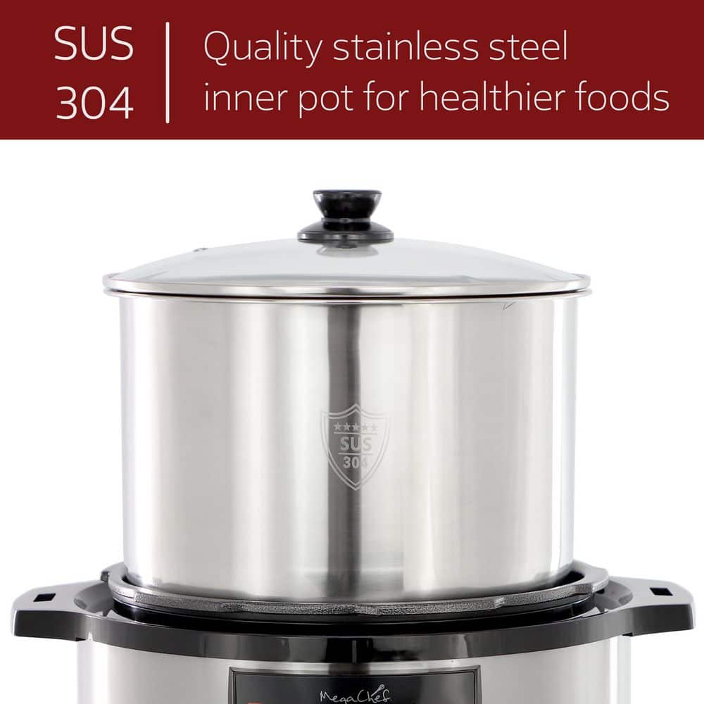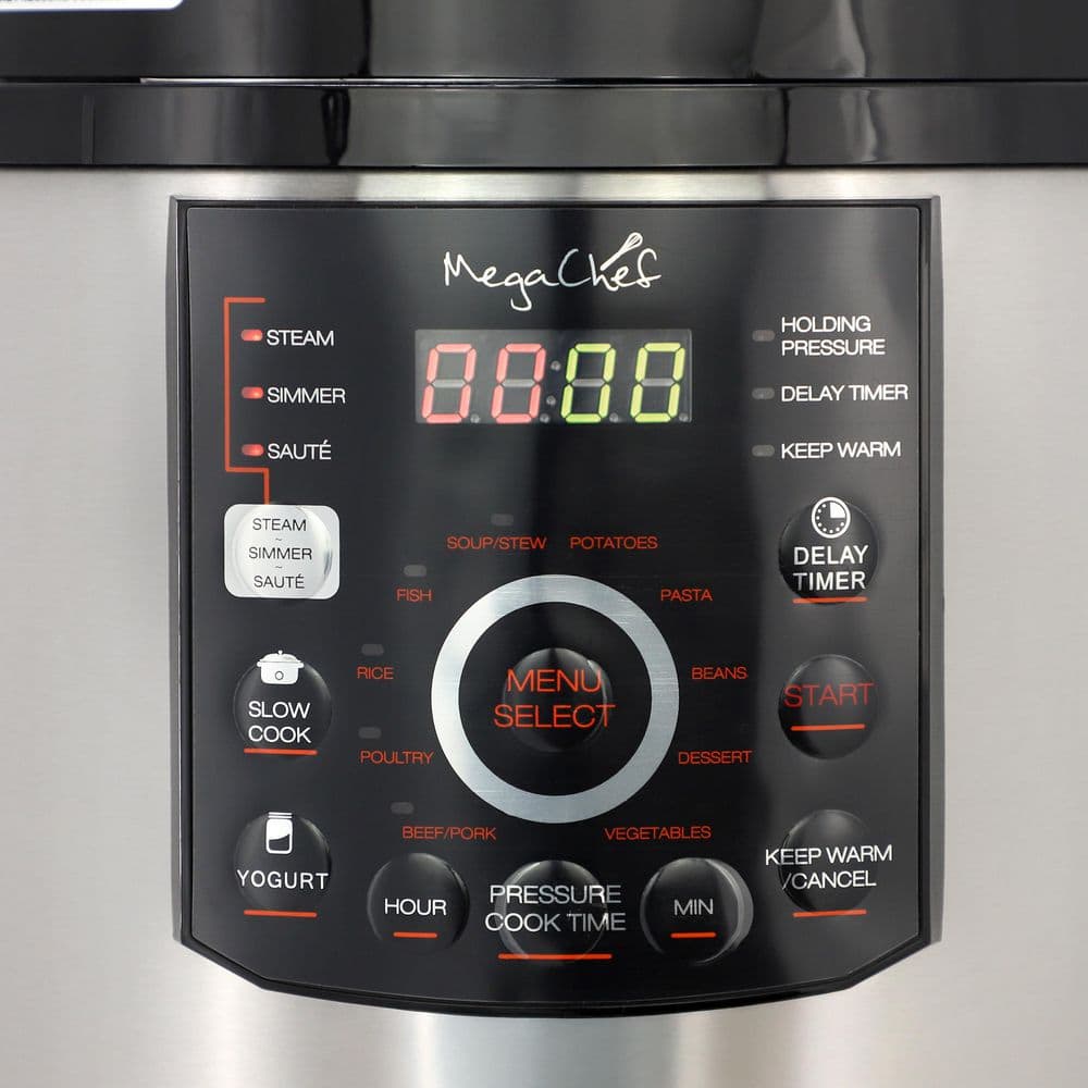 Eat Healthier with MegaChef 12Qt pressure cooker. MegaChef Pressure Cooker with 15 Presets and Glass Lid is sure to become your favorite kitchen sidekick. With this pressure cooker you have the option to cook using the slow cook function for up to 9.5 hours, making this electric cooker perfect for chilies and roasts. The included tempered glass lid allows you to monitor your meals hands-free without letting heat escape.
