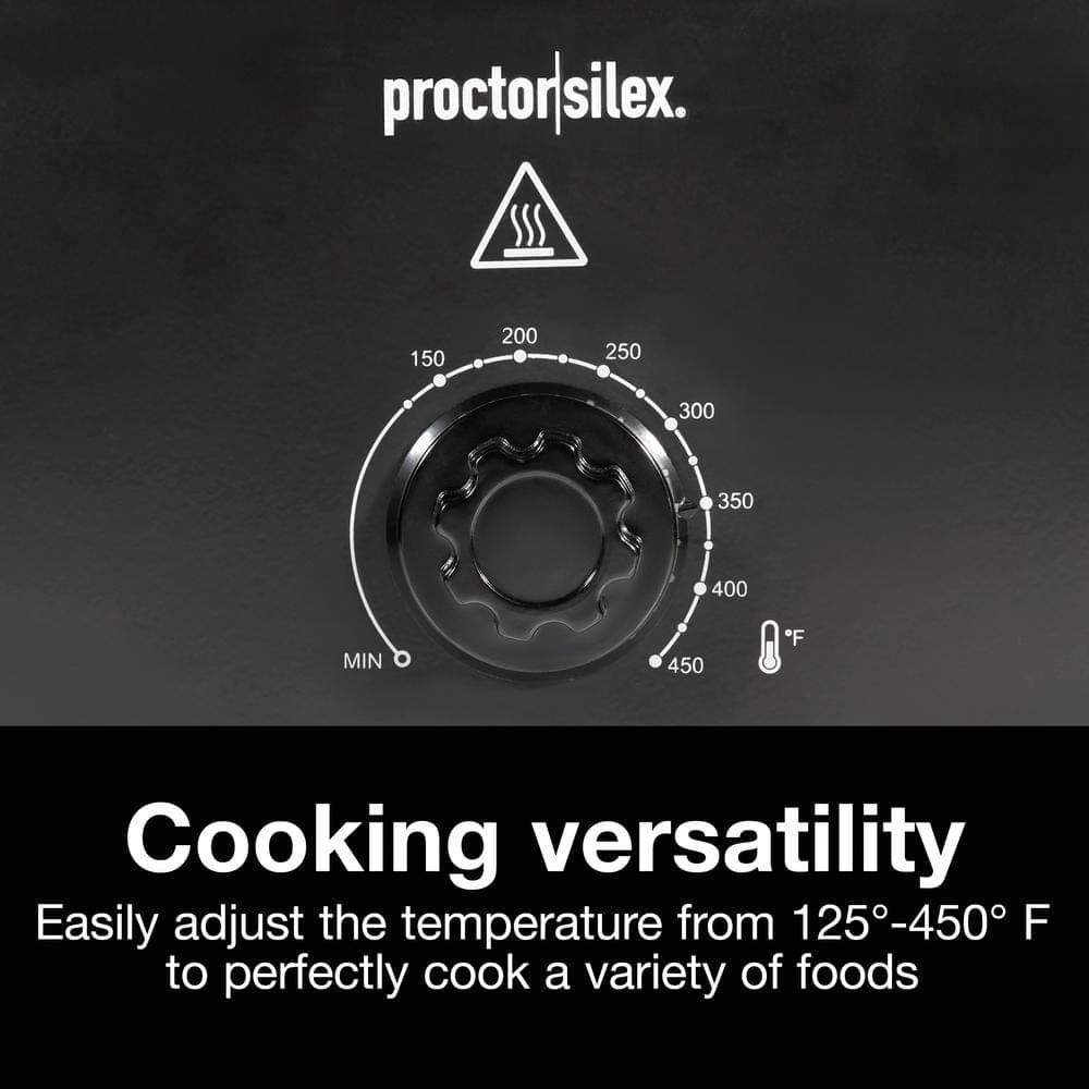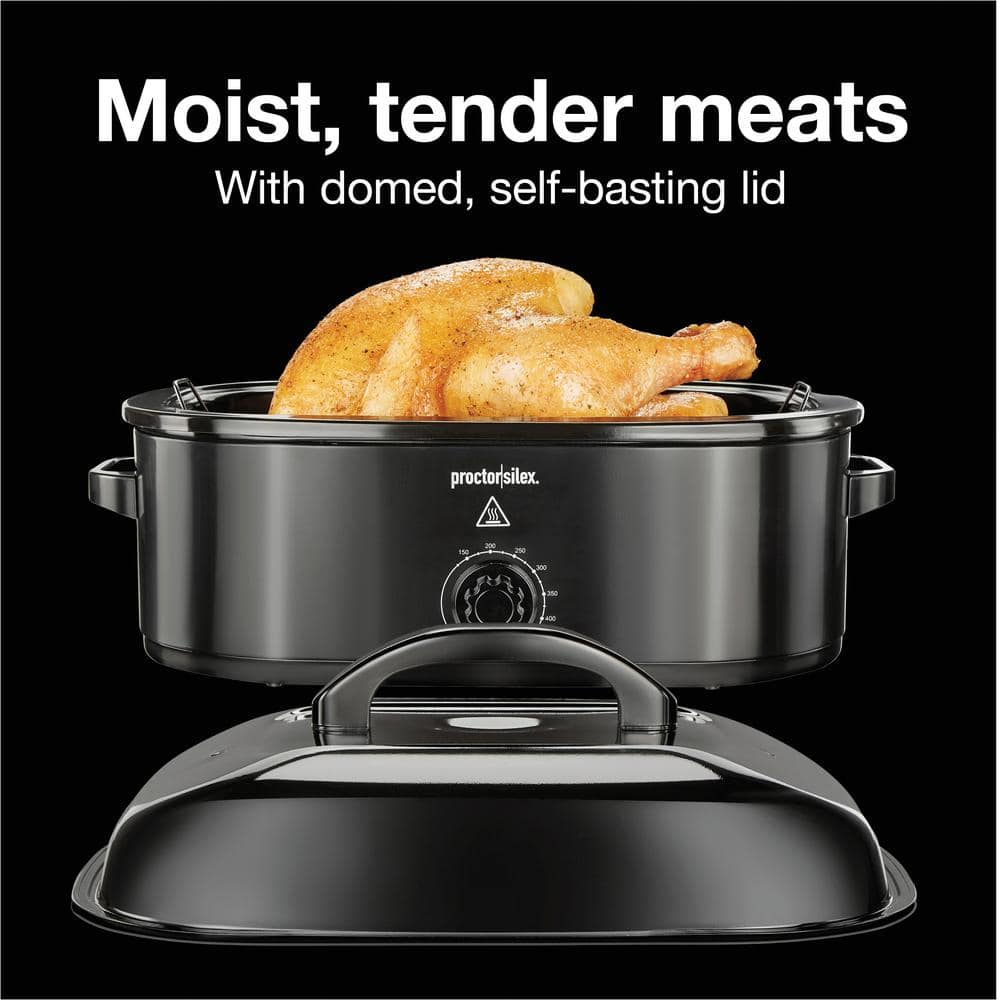 The versatile 18 quart Proctor Silex Electric Roaster Oven with Self-Basting Lid is perfect for holidays and special occasions because it easily adds extra oven space in the kitchen when you need it. It doubles your oven space and is easy to use. It holds a 24 lb. turkey and other large meats. It also steams, slow cooks, bakes, roasts and keeps food warm for serving guests. The roaster oven can do everything from steam vegetables and roast potatoes to bake a cheesecake. The domed, self-basting lid ensures meats like turkey and ham turn out tender, moist and delicious. Easily adjust the temperature from 125 to 450° F with one simple knob to cook a variety of foods. You'll love the convenience of preparing food in one pan in this roaster that's simple and intuitive to use. The removable cooking pan removes for easy cleaning, and the lift-out rack lets you lift large meats like baked ham and roasted turkey from the roaster oven with ease. The large capacity makes the roaster oven perfect for entertaining, whether you're feeding family or hosting a party. It's designed with quality and durability in mind and backed by a 3 year limited warranty.