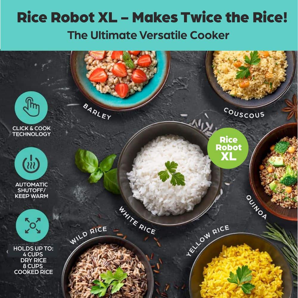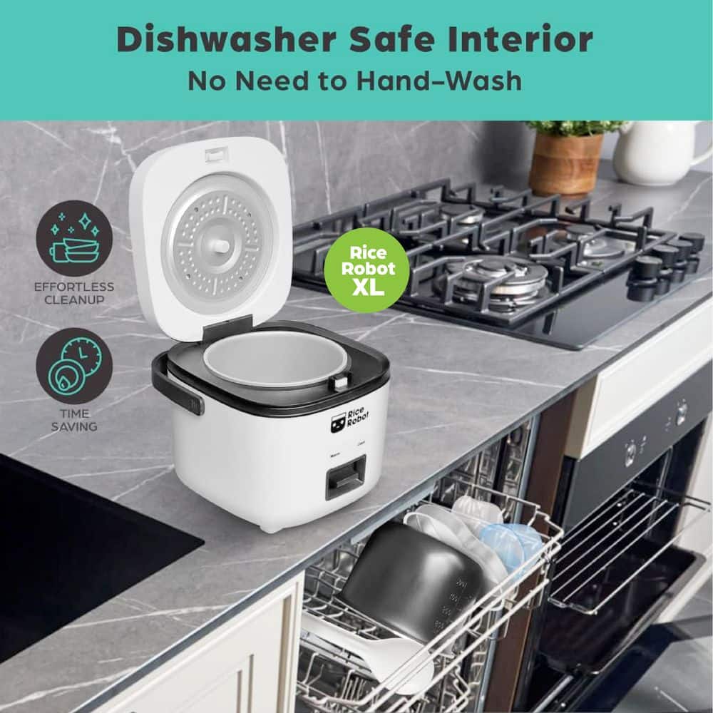 Make ready-to-eat rice in minutes with the compact RICE ROBOT Rice rice cooker. Color-coded cups take the guesswork out of measuring. Cups are sized, so you can add the right amount of rice and water without pulling out any measuring cups and getting more dishes dirty. Simply fill the white cup with rice and pour water into the blue cup. Click the start button and when it's done, the automatic shut off stops cooking and goes into "keep warm" mode. Its innovative 3-step, color-coded system that makes cooking rice virtually goof-proof. Rice Robot cooks every kind of rice, and it is also great for other meals. The ultra nonstick inner pot is dishwasher safe. The space-saving design makes it perfect for dorms, apartments, and RVs. Making rice with Rice Robot is now as simple as 1, 2, 3.