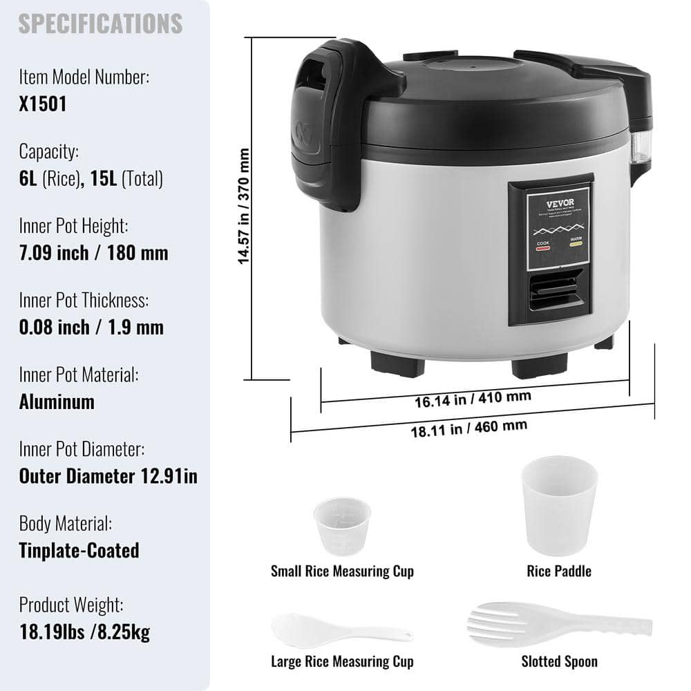 Commercial Rice Cooker. VEVOR Commercial Rice Cooker is made entirely from high-quality materials to be durable. It features a high-power heating base that efficiently concentrates energy, ensuring even heating and effortless cooking. With a non-stick inner pot and streamlined design, cleaning is quick and easy.